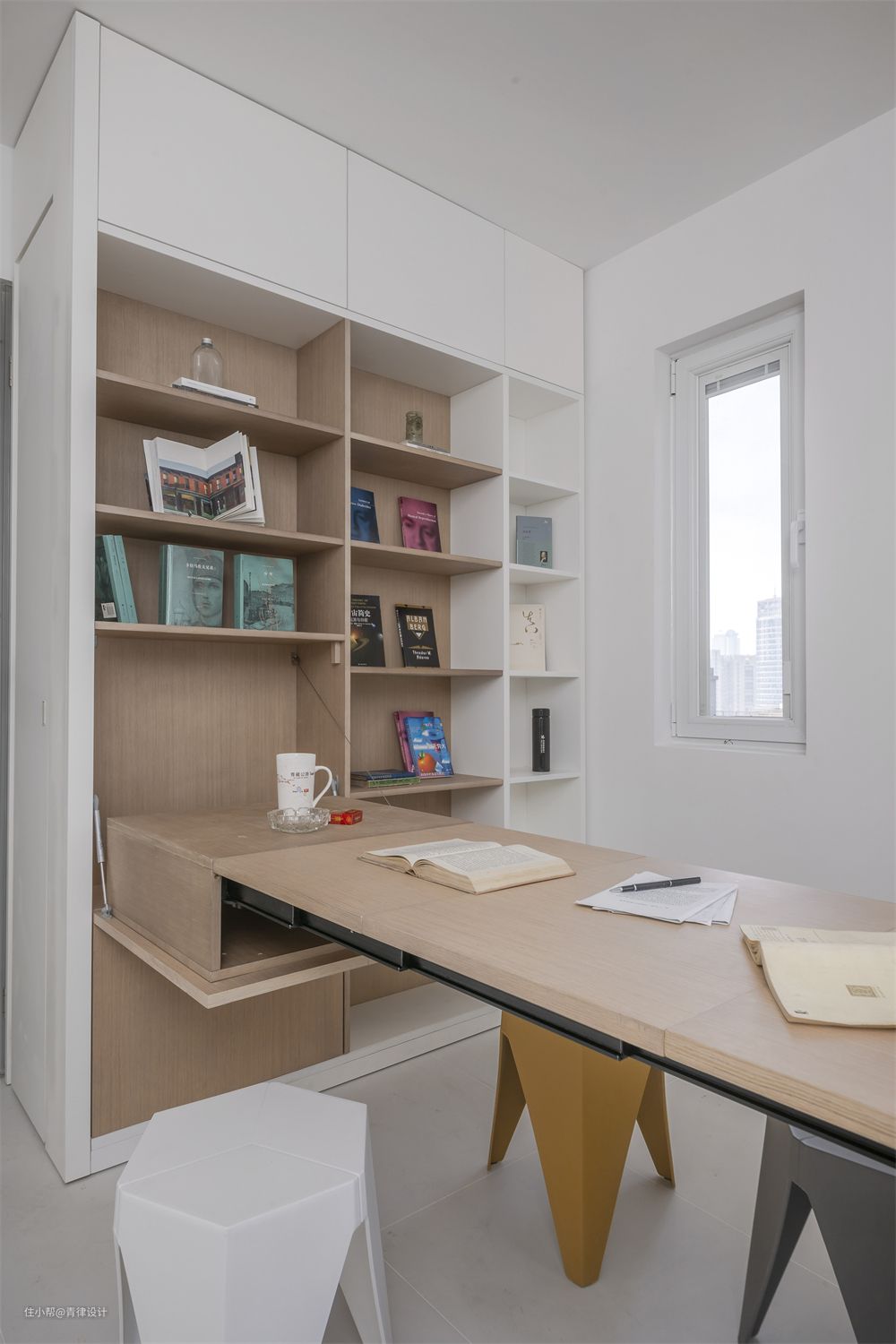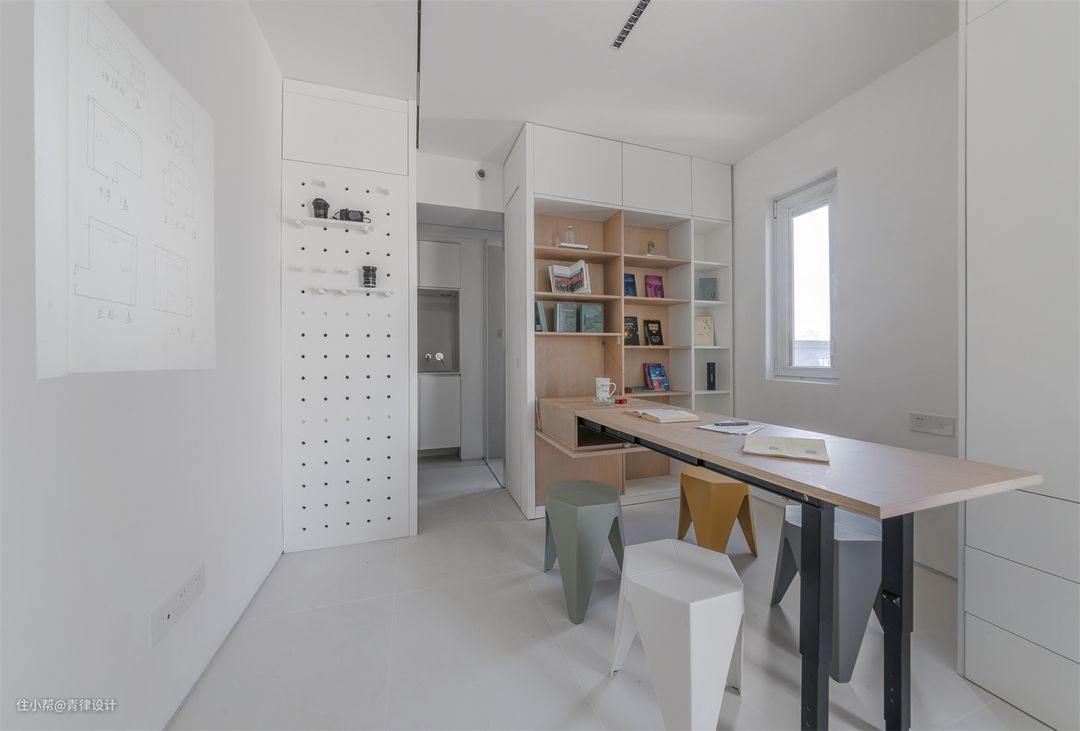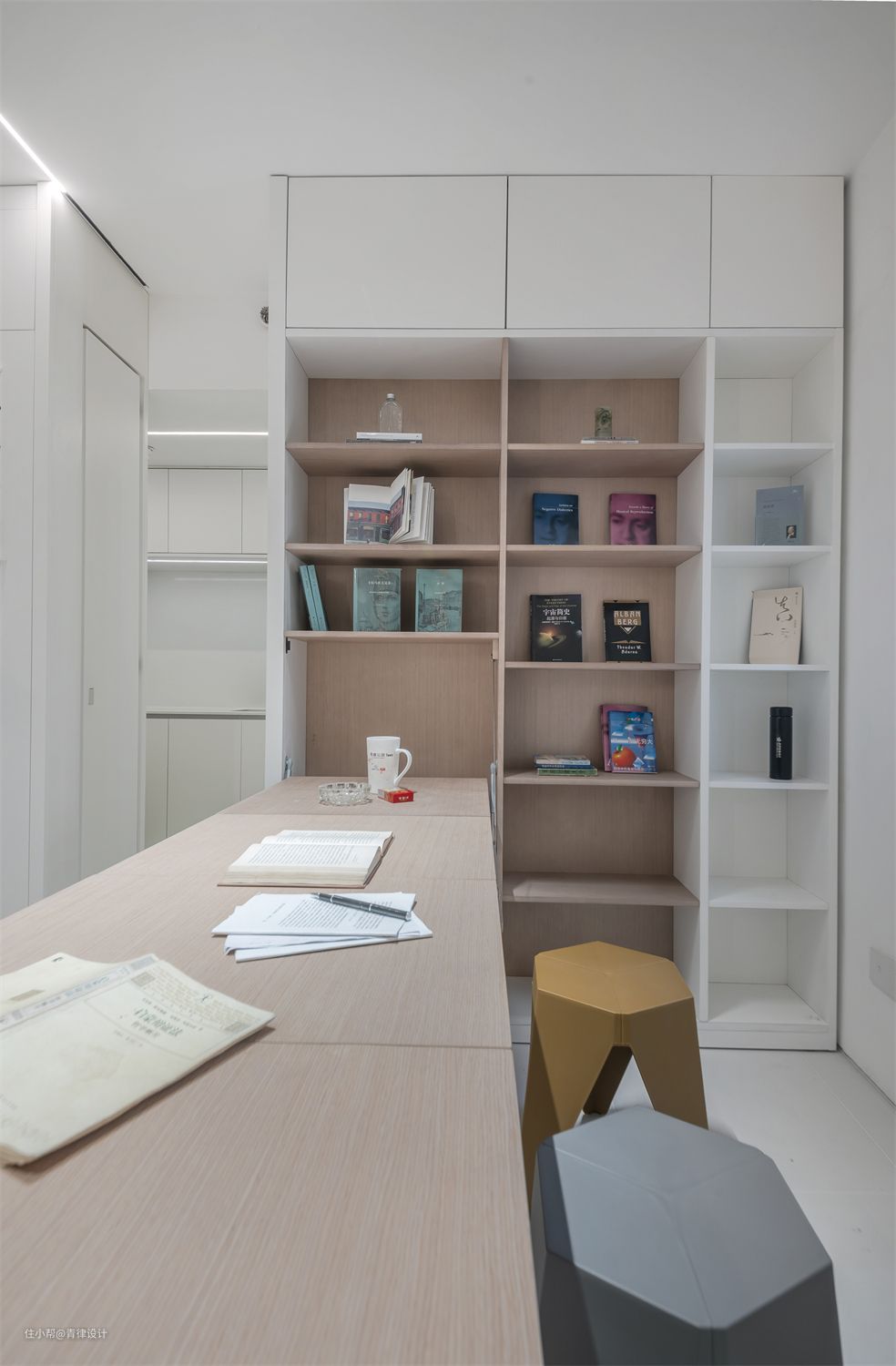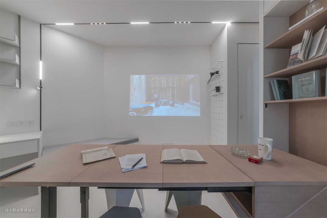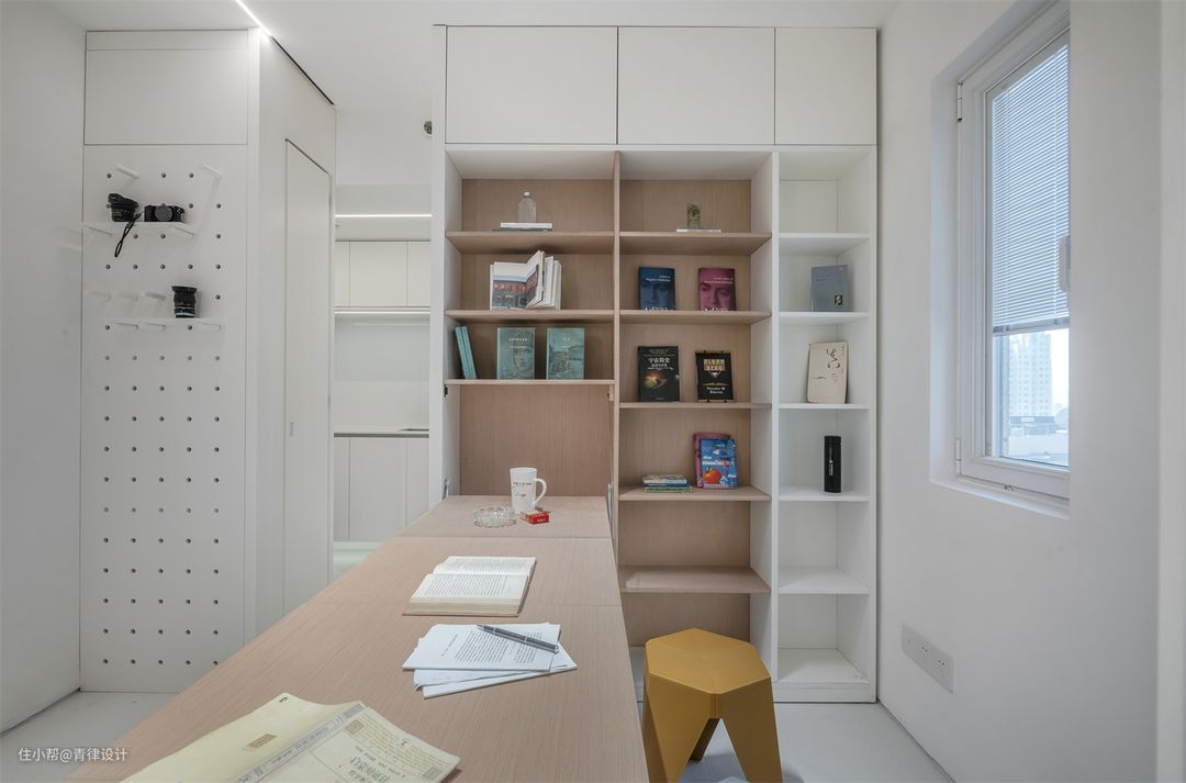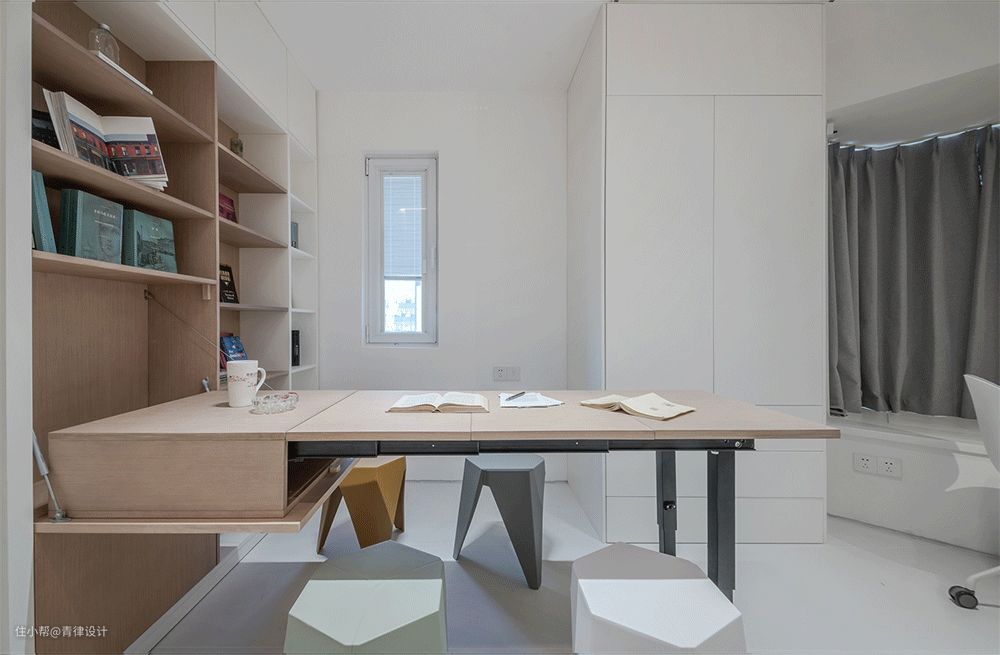 利用率低的东北拐角处,我们设计通顶的柜体,成为空间中的轻质型收纳点,既是衣柜也是空调挂机设备柜! 依附于墙面与角落的位置,衣物、挂机可以藏在融入柜子中,使屋主在视线上对空间没有多余形体的纯粹性的认知被提炼出来。 在只有29㎡的空间,我们通过两个柜体之间的隐形对开门,使空间再次划分成里外两重空间! 我们借助特殊的书桌收缩五金件,从装置柜中拉出打开组装成会议桌。摆上可以叠起收放的凳子,读书研讨的状态形成了! 本来屋主的研讨会需要是三四个人即可,现在项目落地后此状态下能容纳六至八人。看来屋主的书友可以再增加人数了! 读书研讨会状态下的会议桌和书柜的景致,和即将开始参会的氛围!