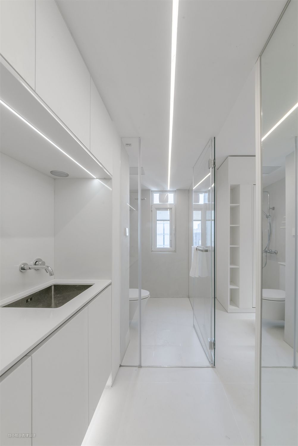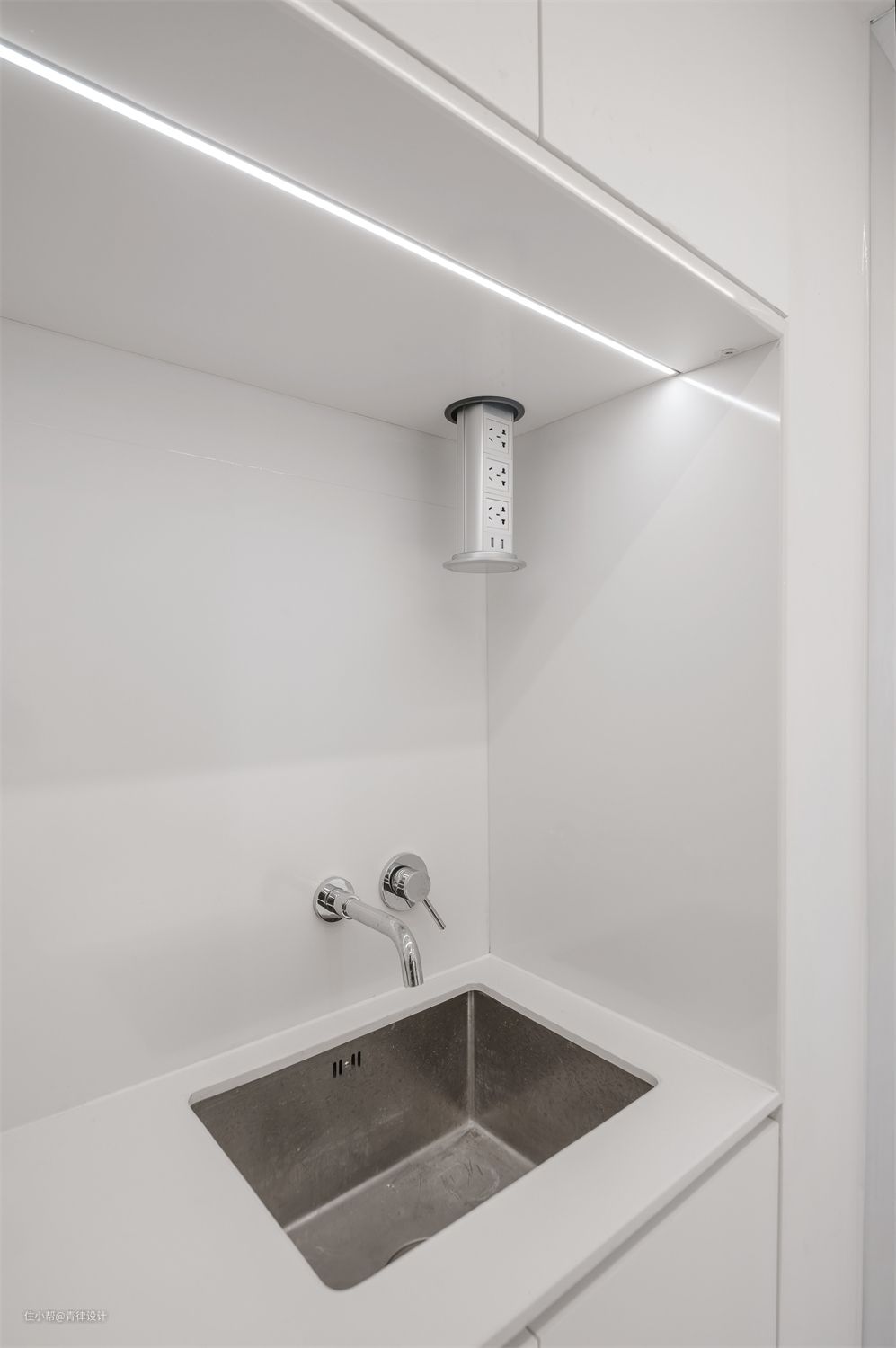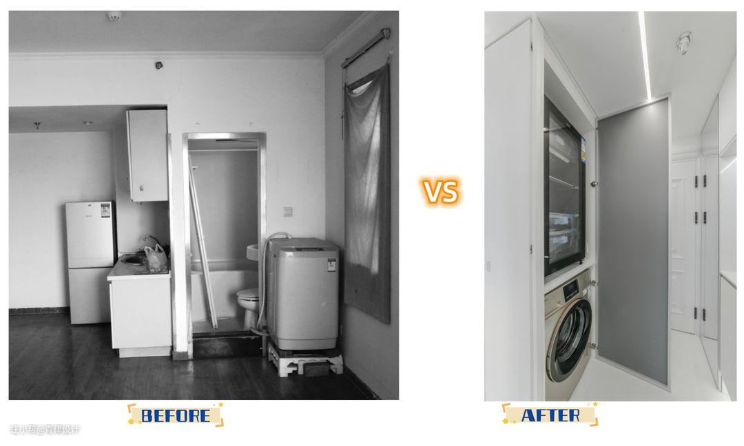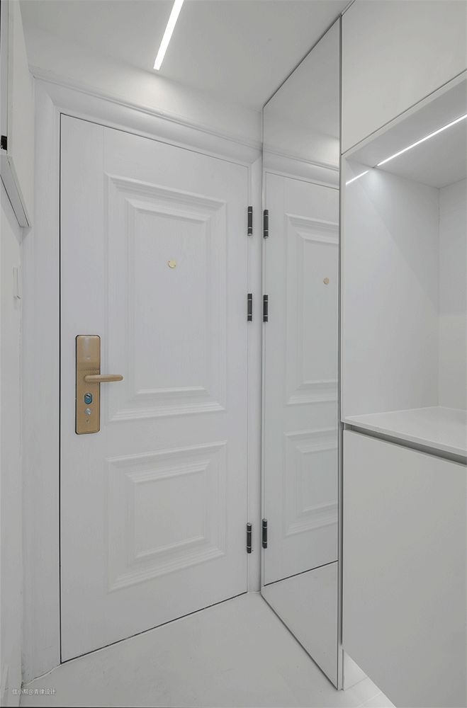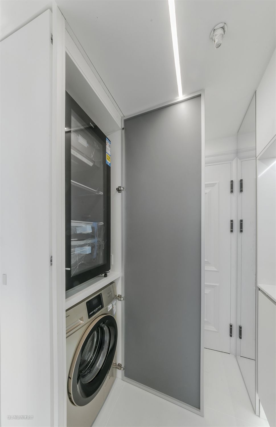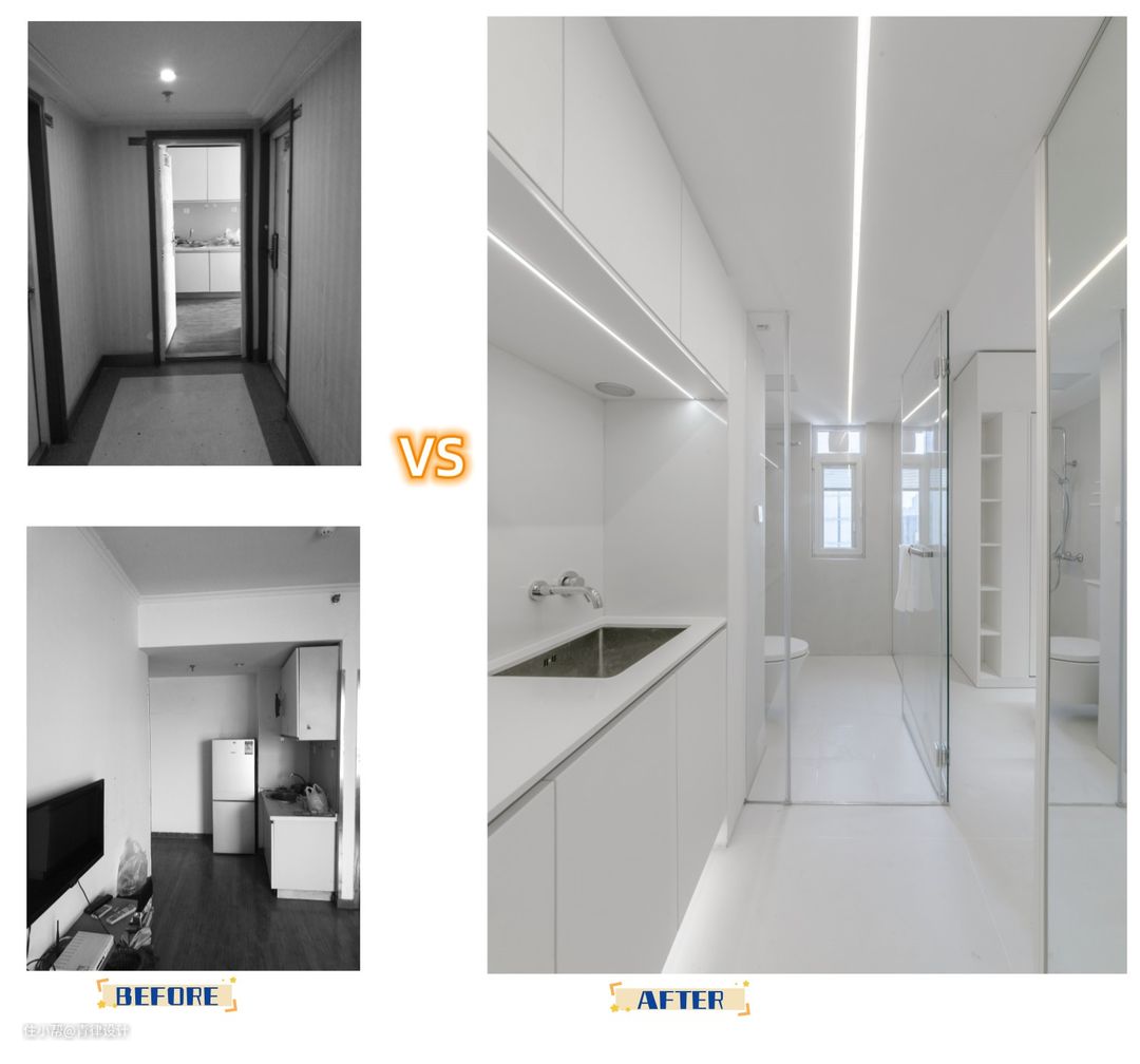 我们拆除进门正对的隔墙,用透明玻璃取代砖砌隔墙,空间一下舒展开了,自然光线也从东北向和北向同时叠加,使进门后的第一感官空间有了质的改变。 整体的色彩上,保持着统一的白灰基调,配以硬朗的LED型材灯,使人看上去空间整洁素雅,科技感十足! 进门的第一空间感官的前后对比! 顶部的LED型材灯,和“迷你厨房”的吊柜和地柜的下口型材灯,都对空间起到“指引视线”的作用!以拉长空间的纵深感!右侧的镜面柜门,起到了放大进门空间的宽度感的作用! 两感的拉长与放大,都是我们在蓄意的增大空间的设计,以解决原先进门空间给人的观感不好尺度不够的问题! 为保持“迷你厨房”台面和墙面的纯净,我们用白色石英石做了带背板的框形盒体,嵌入地柜与吊柜之间。 台面上的电源,我们用安装在吊柜里的“升降电源”取代。 墙排龙头和LED型材灯的加入,使人在此使用厨房时的便捷性很大提高,同时也使屋主使用时,不忍再回到从前的混乱状态了! 屋主进门玄关换鞋换衣的“玄关柜”隐藏于进户门的背后。 镜面柜门起到了放大空间的作用,也是进出门时仪容整理的常备物! 玄关柜与迷你厨房连贯一体,使进门后的换鞋换衣洗手动作也也被连接在一条动线上完成! 进门处“简易厨房”对面的设备柜内,按设计要求新购的冰箱、洗衣机上下安放,解决了原先现场冰洗家电乱放的现象!