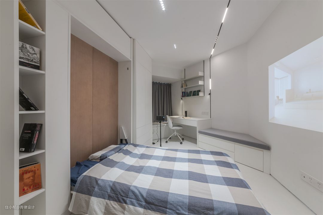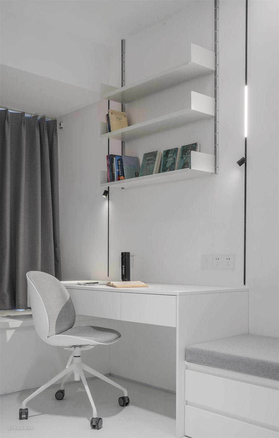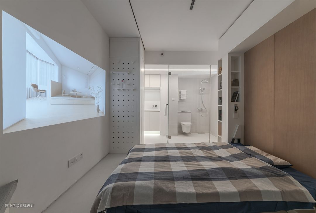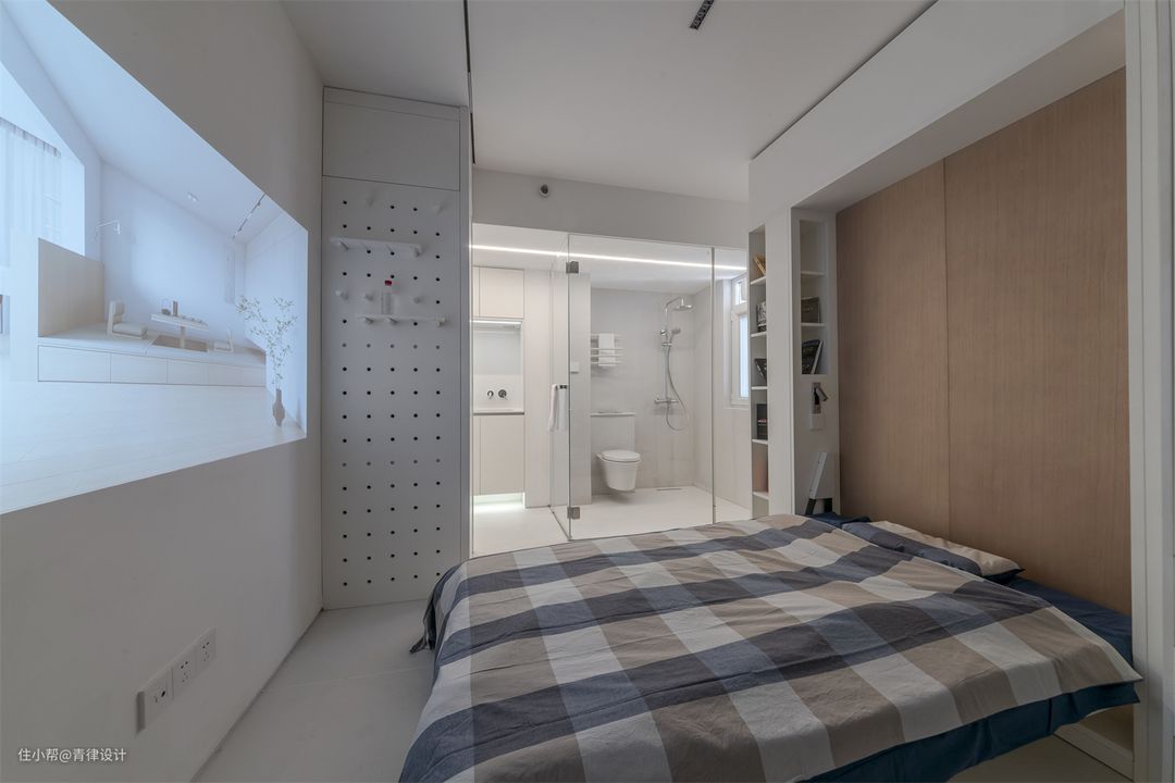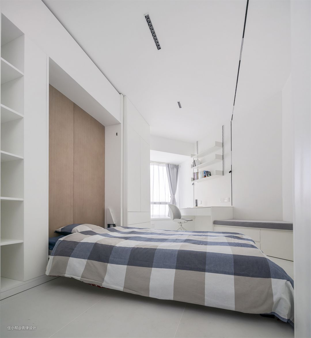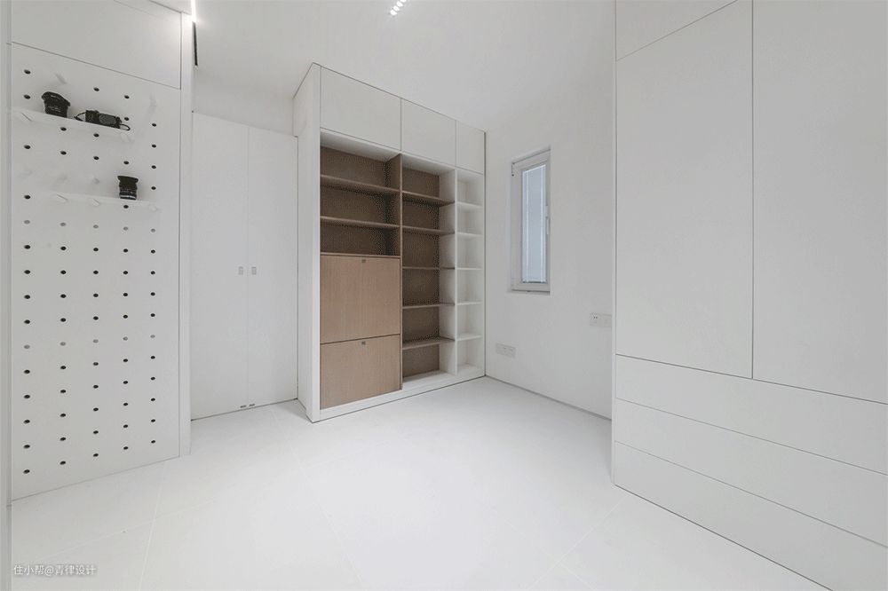 休眠、读书研讨会、收纳、独处写作、空旷等几种功能在此同一空间的复加,我们用“变脸”来实现。 可变的单体装置设计,使空间机能变成一场游戏! 设备柜的背板,我们做出洞洞板来使安置于其中的冰洗设备便于散热,同时也实现出在背后空间中洞洞板的随意搭接的实用性。 整体空间以白色和浅灰为主,自然的木本色在其中点缀,在建筑格局无法改变的前提下,最大限度的利用自然光线,纯白的色调弱化了空间的边界,放大了空间的尺度感。 屋主打开“墨菲床”,随手拿取想看的书籍,拉出并按下我们在装置柜中的“嵌入式阅读灯”,使屋主的卧床看书的随意姿态应运而生。自然木的背板,使层次和温暖感得以提升! 用减法删除空间中的多余形体,灯具、电视、空调都被隐喻起来,突兀形体被概念化消失。 极米投影仪打在墙上的就是我们的即将发表的整屋案例《03年的130平公寓被“极简”后,居然分出了“前后院”》 空间在卧室角色扮演状态下,灯光也是恰到好处的点缀。 线性磁吸轨道灯,由顶部下墙至飘窗前的书桌上,科技感的指示性交待着空间的景深!