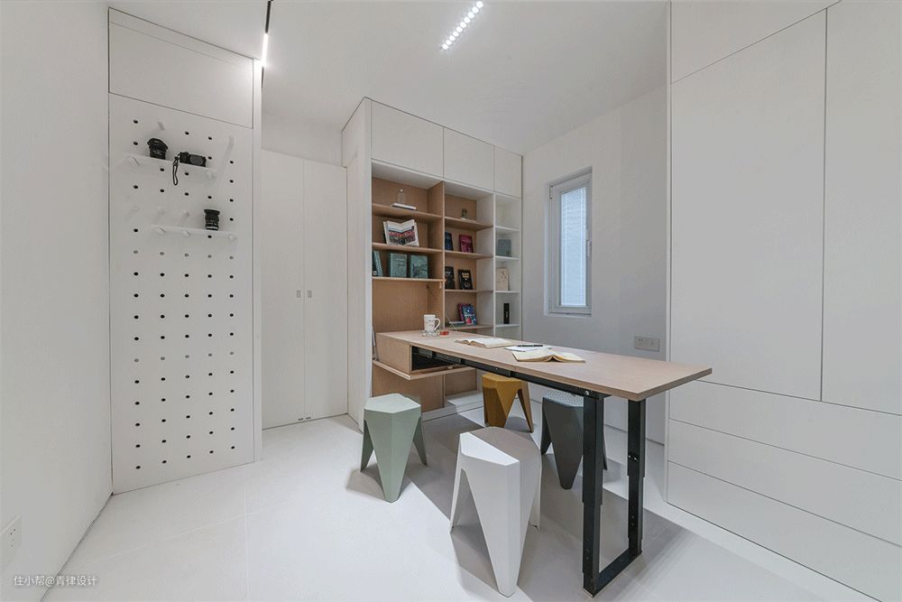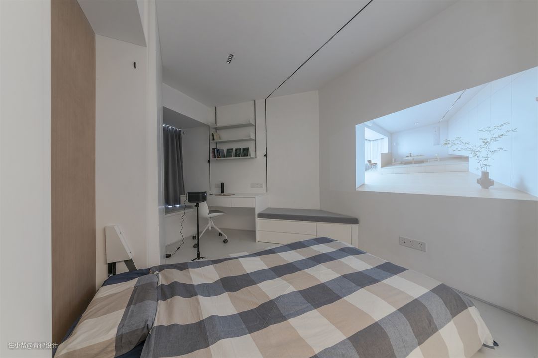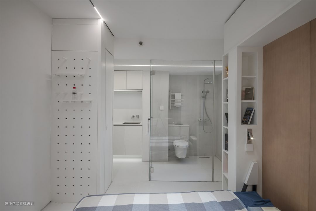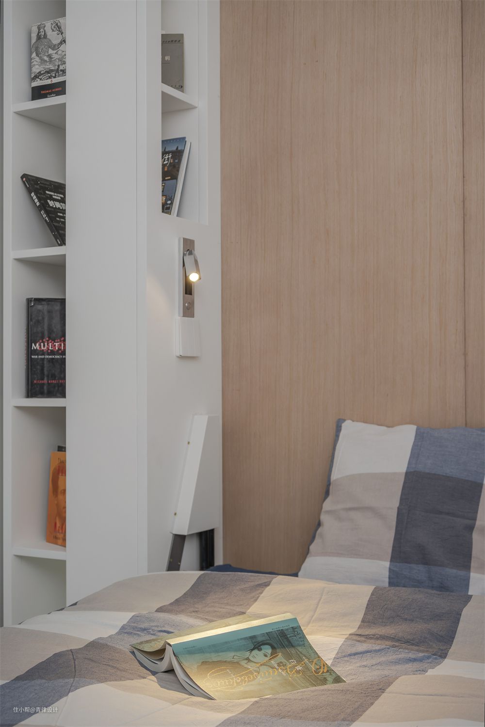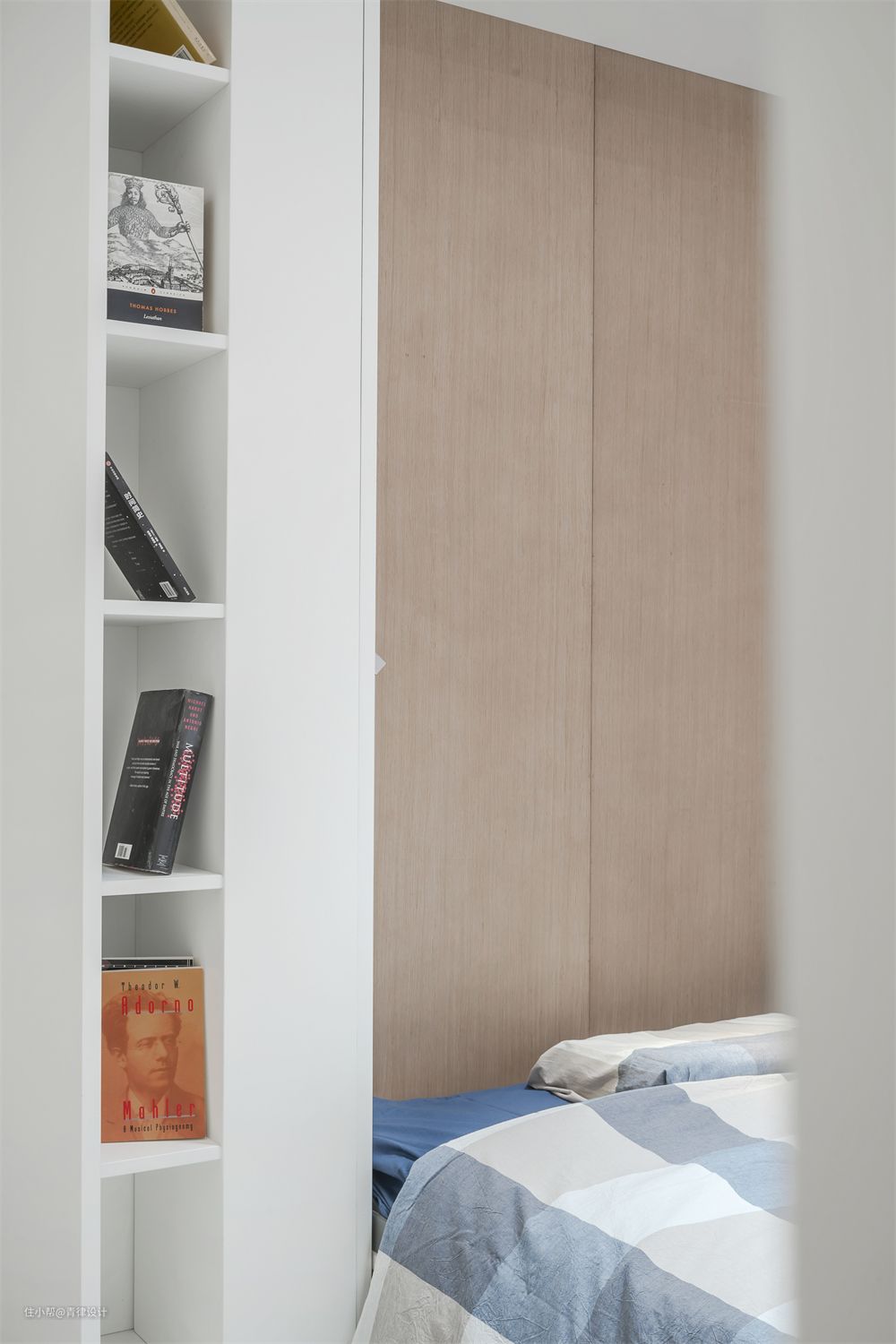 休眠、读书研讨会、收纳、独处写作、空旷等几种功能在此同一空间的复加,我们用“变脸”来实现。 可变的单体装置设计,使空间机能变成一场游戏! 设备柜的背板,我们做出洞洞板来使安置于其中的冰洗设备便于散热,同时也实现出在背后空间中洞洞板的随意搭接的实用性。 整体空间以白色和浅灰为主,自然的木本色在其中点缀,在建筑格局无法改变的前提下,最大限度的利用自然光线,纯白的色调弱化了空间的边界,放大了空间的尺度感。 屋主打开“墨菲床”,随手拿取想看的书籍,拉出并按下我们在装置柜中的“嵌入式阅读灯”,使屋主的卧床看书的随意姿态应运而生。自然木的背板,使层次和温暖感得以提升! 用减法删除空间中的多余形体,灯具、电视、空调都被隐喻起来,突兀形体被概念化消失。 极米投影仪打在墙上的就是我们的即将发表的整屋案例《03年的130平公寓被“极简”后,居然分出了“前后院”》 空间在卧室角色扮演状态下,灯光也是恰到好处的点缀。 线性磁吸轨道灯,由顶部下墙至飘窗前的书桌上,科技感的指示性交待着空间的景深!