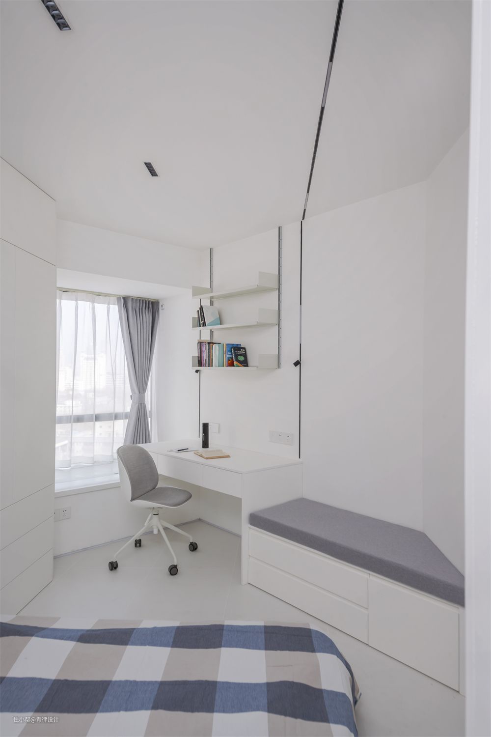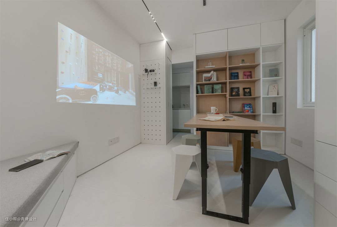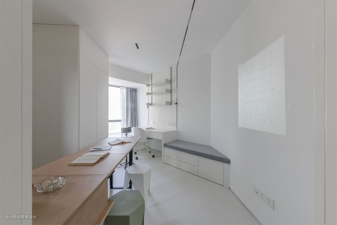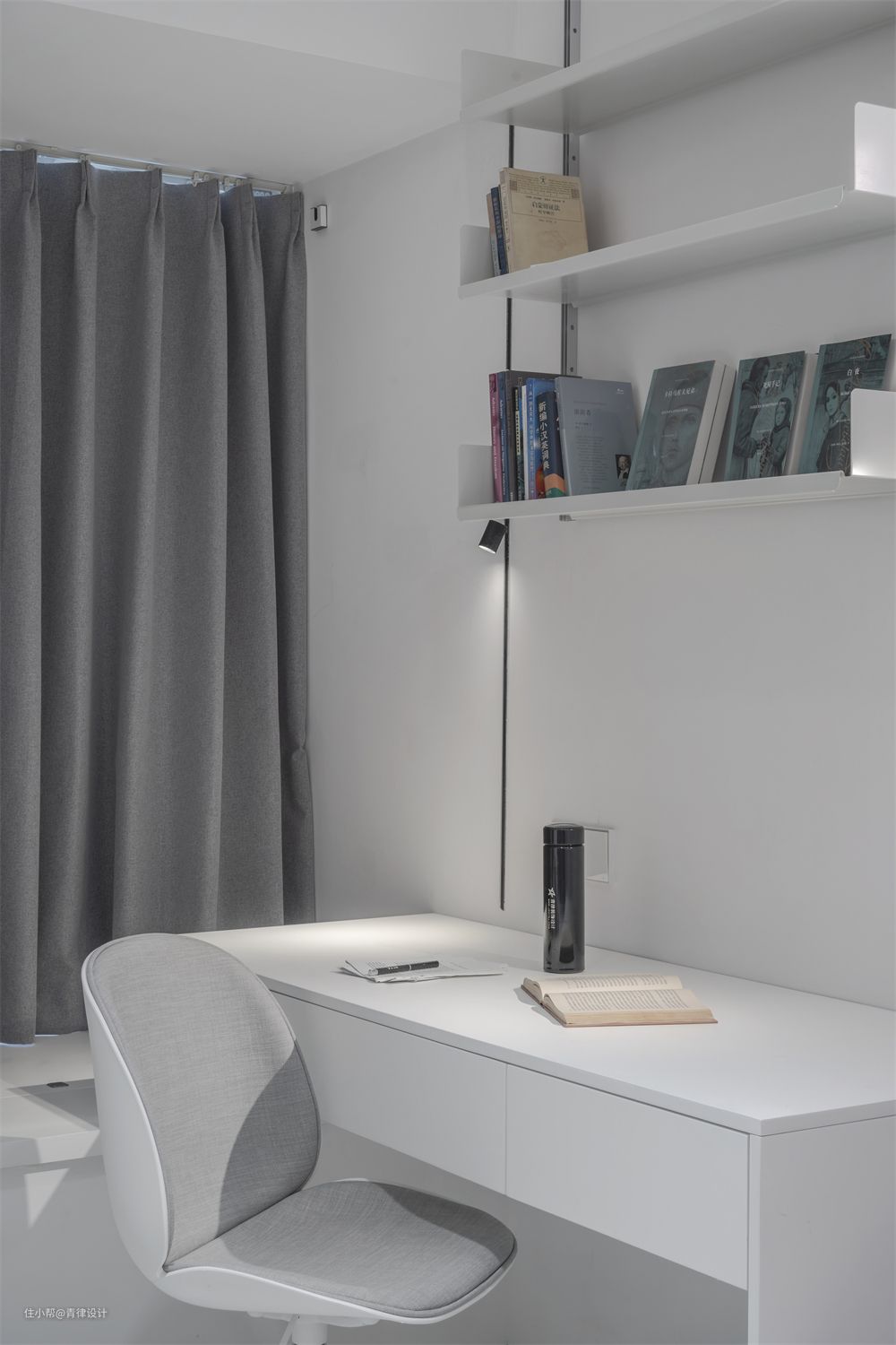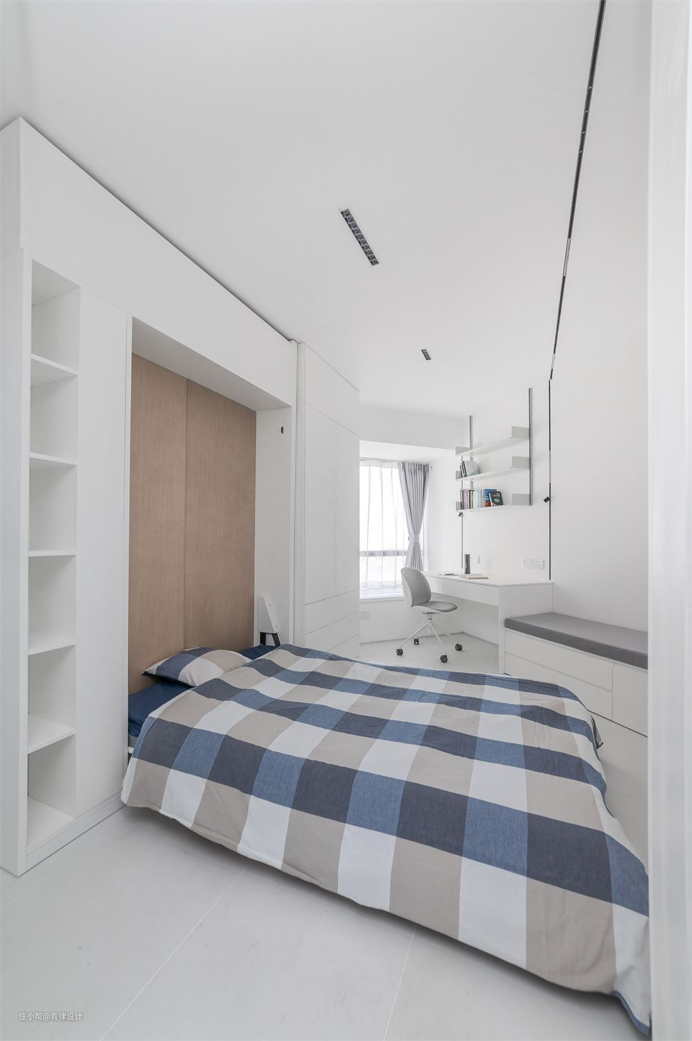 休眠、读书研讨会、收纳、独处写作、空旷等几种功能在此同一空间的复加,我们用“变脸”来实现。 可变的单体装置设计,使空间机能变成一场游戏! 设备柜的背板,我们做出洞洞板来使安置于其中的冰洗设备便于散热,同时也实现出在背后空间中洞洞板的随意搭接的实用性。 整体空间以白色和浅灰为主,自然的木本色在其中点缀,在建筑格局无法改变的前提下,最大限度的利用自然光线,纯白的色调弱化了空间的边界,放大了空间的尺度感。 屋主打开“墨菲床”,随手拿取想看的书籍,拉出并按下我们在装置柜中的“嵌入式阅读灯”,使屋主的卧床看书的随意姿态应运而生。自然木的背板,使层次和温暖感得以提升! 用减法删除空间中的多余形体,灯具、电视、空调都被隐喻起来,突兀形体被概念化消失。 极米投影仪打在墙上的就是我们的即将发表的整屋案例《03年的130平公寓被“极简”后,居然分出了“前后院”》 空间在卧室角色扮演状态下,灯光也是恰到好处的点缀。 线性磁吸轨道灯,由顶部下墙至飘窗前的书桌上,科技感的指示性交待着空间的景深!
