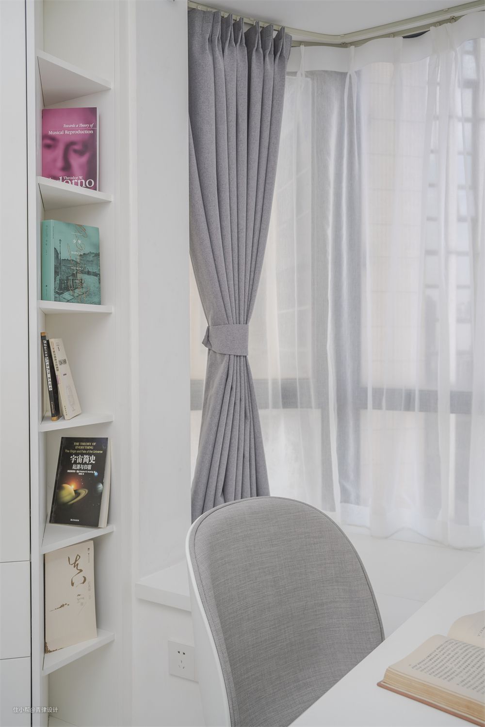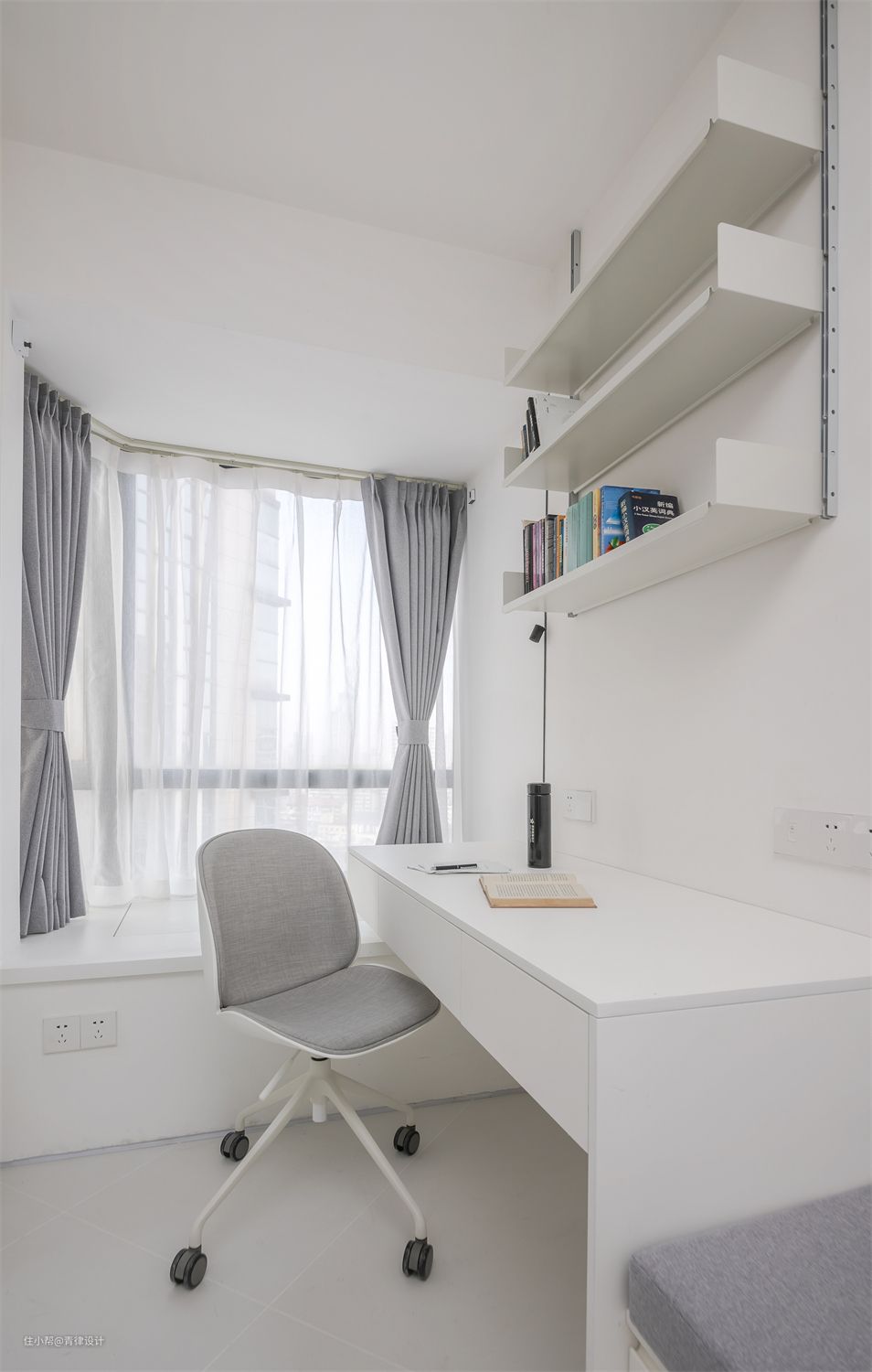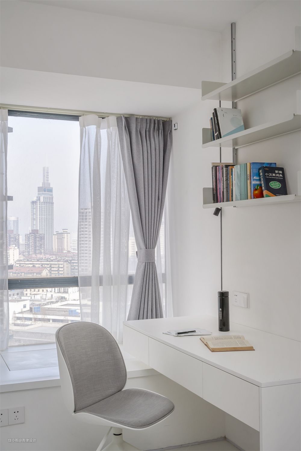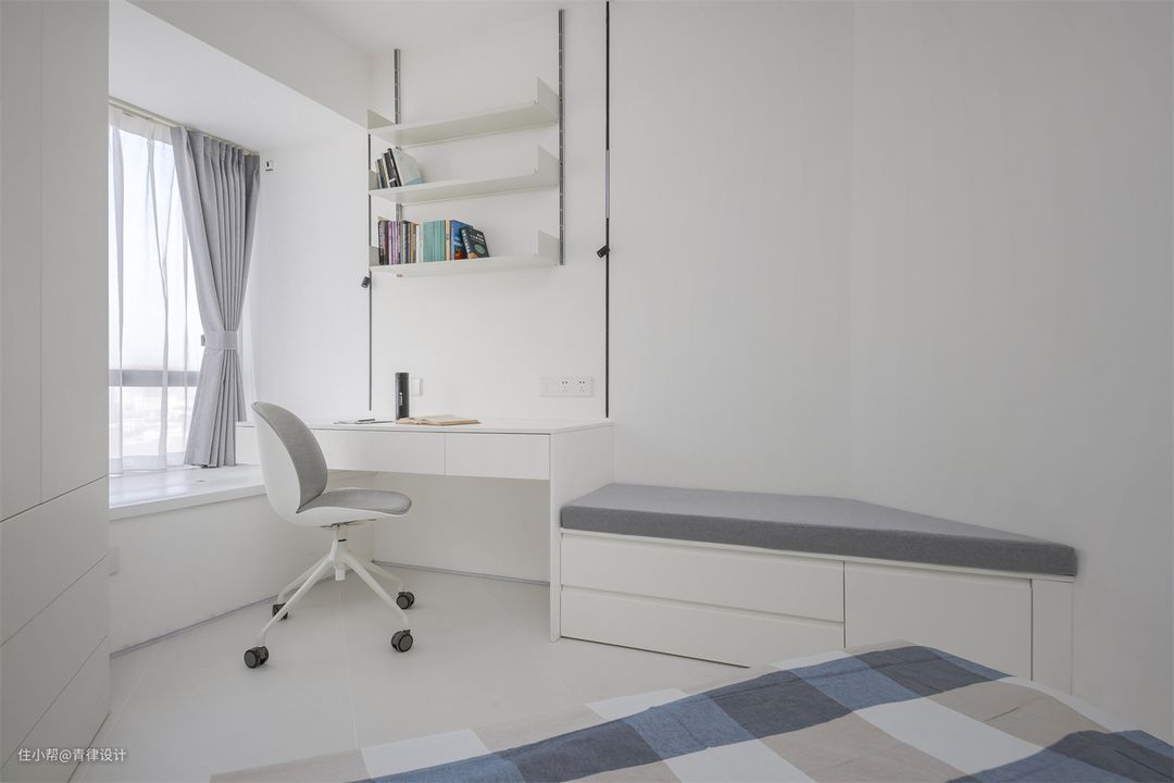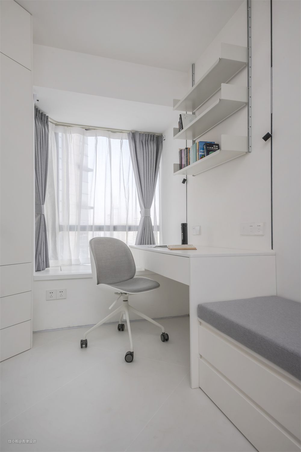 休眠、读书研讨会、收纳、独处写作、空旷等几种功能在此同一空间的复加,我们用“变脸”来实现。 可变的单体装置设计,使空间机能变成一场游戏! 设备柜的背板,我们做出洞洞板来使安置于其中的冰洗设备便于散热,同时也实现出在背后空间中洞洞板的随意搭接的实用性。 整体空间以白色和浅灰为主,自然的木本色在其中点缀,在建筑格局无法改变的前提下,最大限度的利用自然光线,纯白的色调弱化了空间的边界,放大了空间的尺度感。 屋主打开“墨菲床”,随手拿取想看的书籍,拉出并按下我们在装置柜中的“嵌入式阅读灯”,使屋主的卧床看书的随意姿态应运而生。自然木的背板,使层次和温暖感得以提升! 用减法删除空间中的多余形体,灯具、电视、空调都被隐喻起来,突兀形体被概念化消失。 极米投影仪打在墙上的就是我们的即将发表的整屋案例《03年的130平公寓被“极简”后,居然分出了“前后院”》 空间在卧室角色扮演状态下,灯光也是恰到好处的点缀。 线性磁吸轨道灯,由顶部下墙至飘窗前的书桌上,科技感的指示性交待着空间的景深!