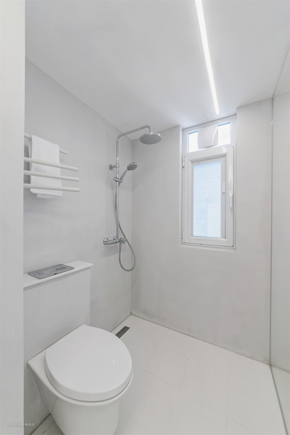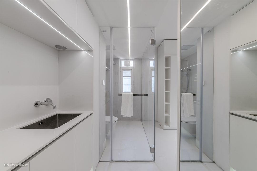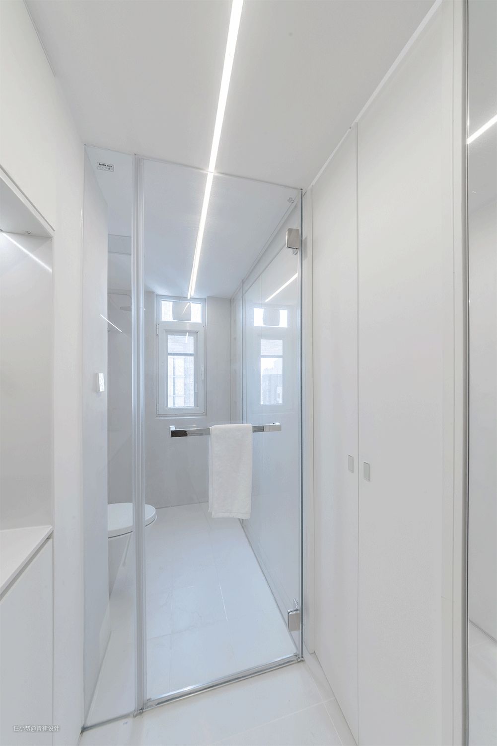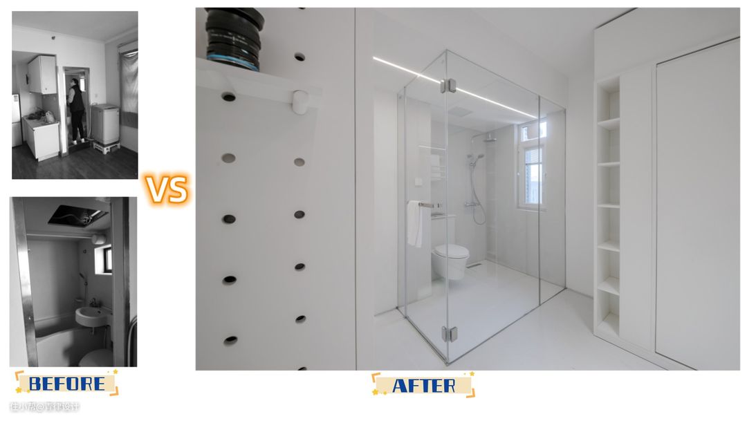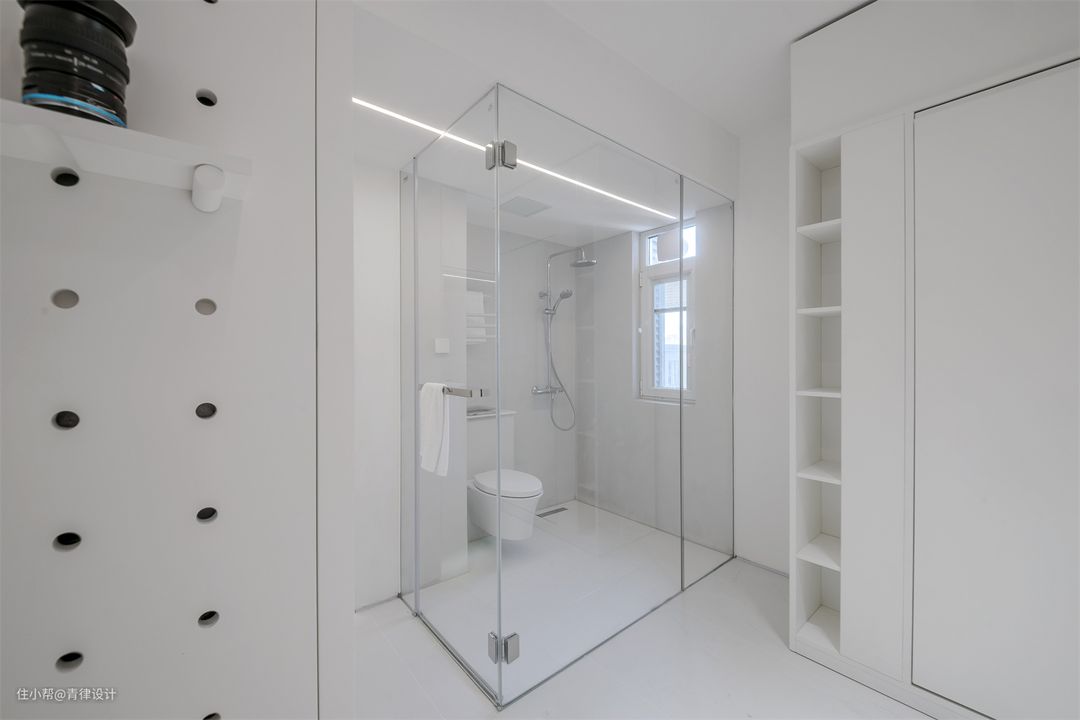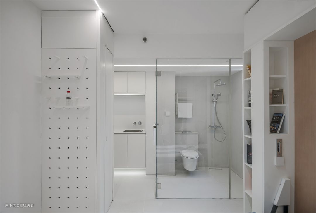 卫生间湿区墙面整体使用了无缝的微水泥,在整体感上得到了意想不到的完整效果! 地面我们使用了和微水泥质感接近的地砖,是因为在淋浴区域用水,不是能及时淌水干净,从而造成有的地方的积水侵泡着微水泥,会造成微水泥的“起鼓开裂”。 其上的电热毛巾架,在前期水电施工交底时,要请供应商提前上门给到出线位置的定位,以免造成后期毛巾架到现场时安装不了。电工还要重新开槽移线,瓦工油工修补墙面槽口的问题。 改造后的卫生间营造成透明的玻璃盒体,且使卫生间与其他的空间光线能相互影响,面积上也能互补,彼此做面积上的加法,使空间变大,时尚而又前卫! 挂墙式座便器,使打扫卫生更加方便! 为了建造出极简没有下挡水石材的“下沉式淋浴房”效果,同时也要保证几乎与卫生间湿区地面等高的其他空间,不出现渗水的现象。 我们在卫生间湿区地面做了两次防水,第一次是丙纶布防水,第二次是滚涂柔性防水,最后再做渗水实验! 旋转柜体与设备柜之间我们设计了可以完全隔断里外空间的对开门,使用户隐私得到必要的保护,同时在29㎡的小公寓里营造出传统的可开可合的再分空间格局。 做通顶入墙入地的钢化玻璃隔断,需事先在墙地面和顶面预留出相应的插入玻璃槽口。 还有一点更为重要:一定要在玻璃下单前,测好电梯轿厢能进玻璃的最大尺寸,如走消防楼梯运玻璃,一定要在拐弯处测好玻璃可拐弯的最大尺寸,以免玻璃做好后上不了楼,无法进入工地现场。