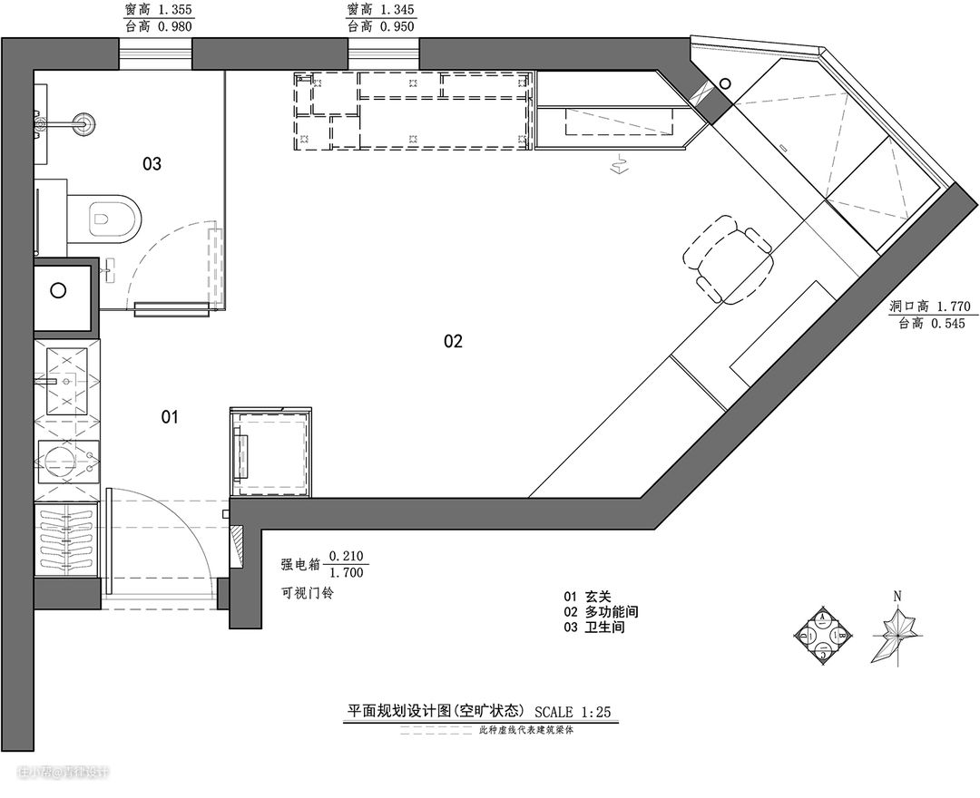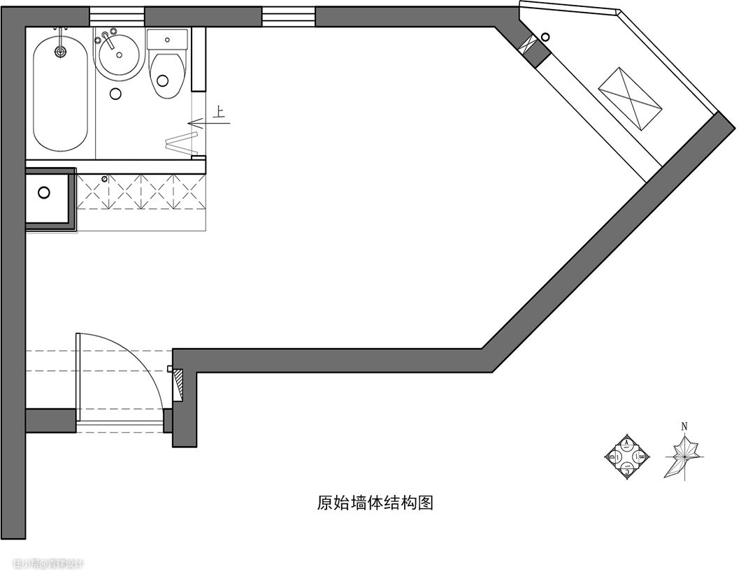 户型分析: 1.整体户型是一室一卫和进门正对带一简单厨柜的酒店式公寓。东北和东南临窗的位置各有一道拐弯墙体,形成了不规则的夹角形状; 2.房屋结构类型是“框剪”结构,大部分墙体都是“剪力墙”,墙体可改动幅度很有限。 3.由于大部分窗户朝北或东北,所以在白天的时间段里的自然采光入户时长有限; 4.进门处正对的是与卫生间的隔墙,使自然采光被遮挡住了大半,所以进门处的光线不是很充裕,主要是靠来自东北向里间区域的“余光”; 5.室内没有标准的厨房空间,只有进门处简单的一排带洗槽的厨柜,以做简餐之用,室内不通天然气。 6.原有卫生间面积较小,还要抬脚踏入,使用不是很方便; 7.整体户型很小也没有储藏间,收纳功能的丧失,从而造成屋主的生活用品随意乱放,给人以凌乱无序的感观; 8.此户所在的楼层是十几楼,且楼盘处于市中心位置,所以窗外的市中心景观较好;