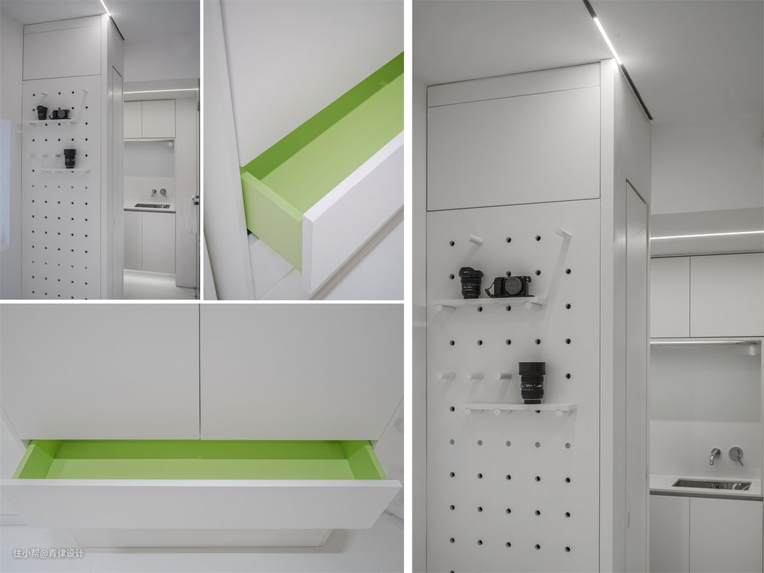 我们在全屋中设计的木饰面柜体,主要以混油白色和自然木色为主,于是在打开的柜体内部我们选择了绿色的免漆板,希望在着偏科技感和素净感的空间中,突然自然的元素在与屋主捉着迷藏! 洞洞板的运用,使屋主的随手摆放和拿取物品变得很自然和随心,尽量不会把小物品胡乱摆放了!