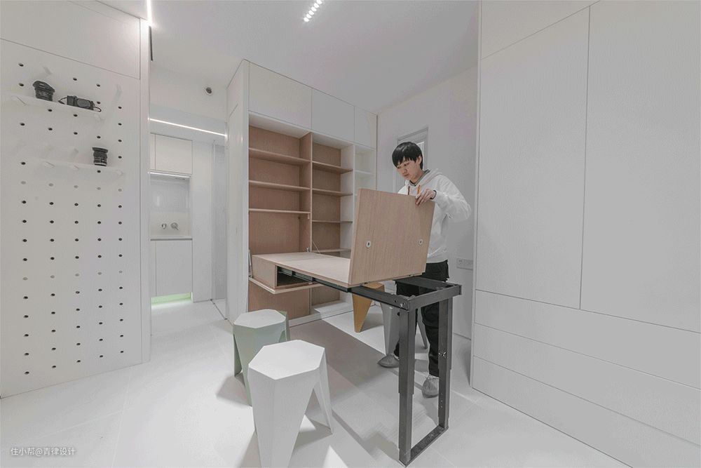 在如此小的空间里!如何才能满足屋主的需求?是我们一直在纠结的设计痛点! 后来我们采取了"装置设计"这个设计课题。 通过单体装置的不同变化,在不增大空间面积的前提,变化出几种空间功能!