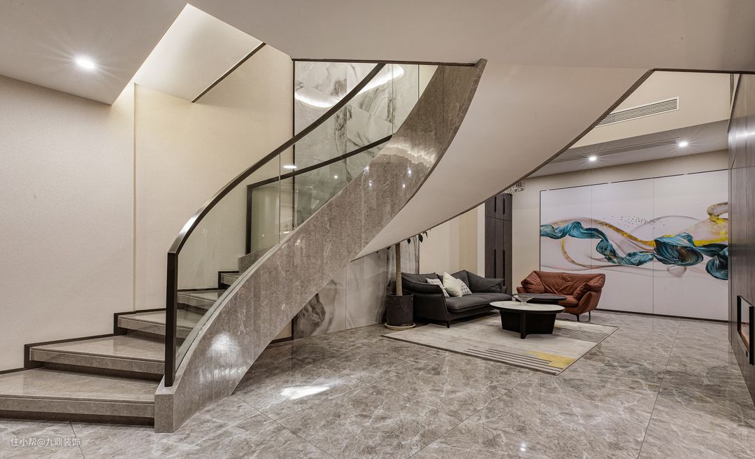 “地下室”地下室有5米的层高,所以做了夹层,变成两层。 “楼梯”由于地下两层都为公共活动区,所以做了通高设计,用弧形楼梯将两层空间融合起来。 “玄关”一楼花园在南面,北入户门正对小区通道。所以在设计中做了玄关隔断,增强隐私性。