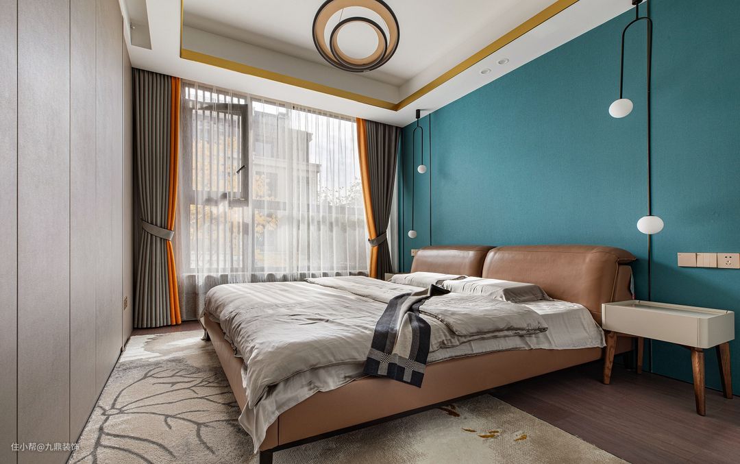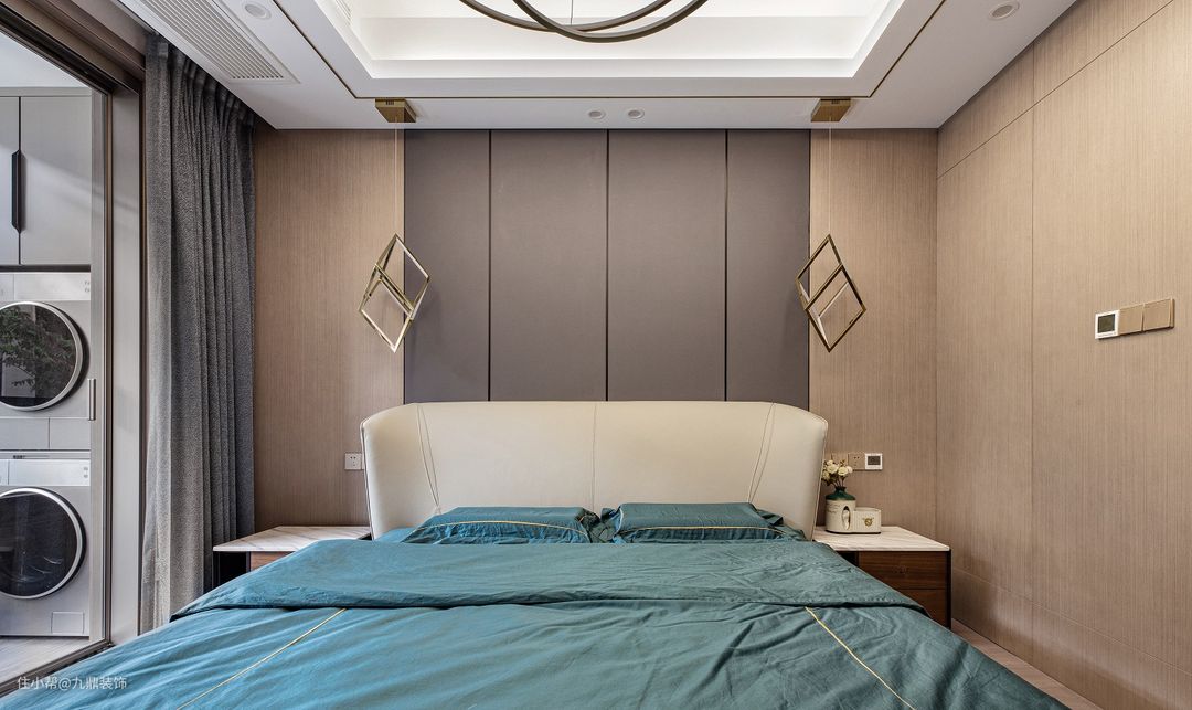 主卧整体以原木色为主调,营造一个自然、温馨的氛围。不规则的线型灯增加空间造型感,这种灯具可以让卧室更加具有设计感,而且可以起到一定的照明效果,使整个空间更加舒适 主卧卫生间进行了干湿分离,增加了卫生间的使用效率和舒适度。大理石瓷砖独有的镜面感,让空间更加通透明亮。