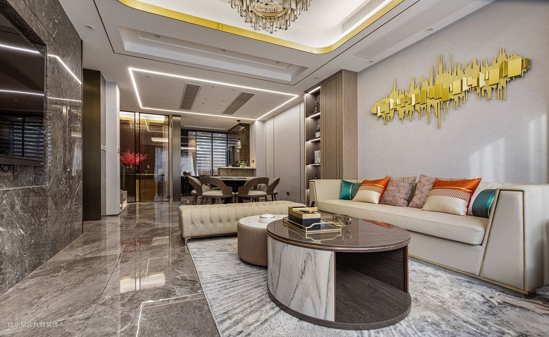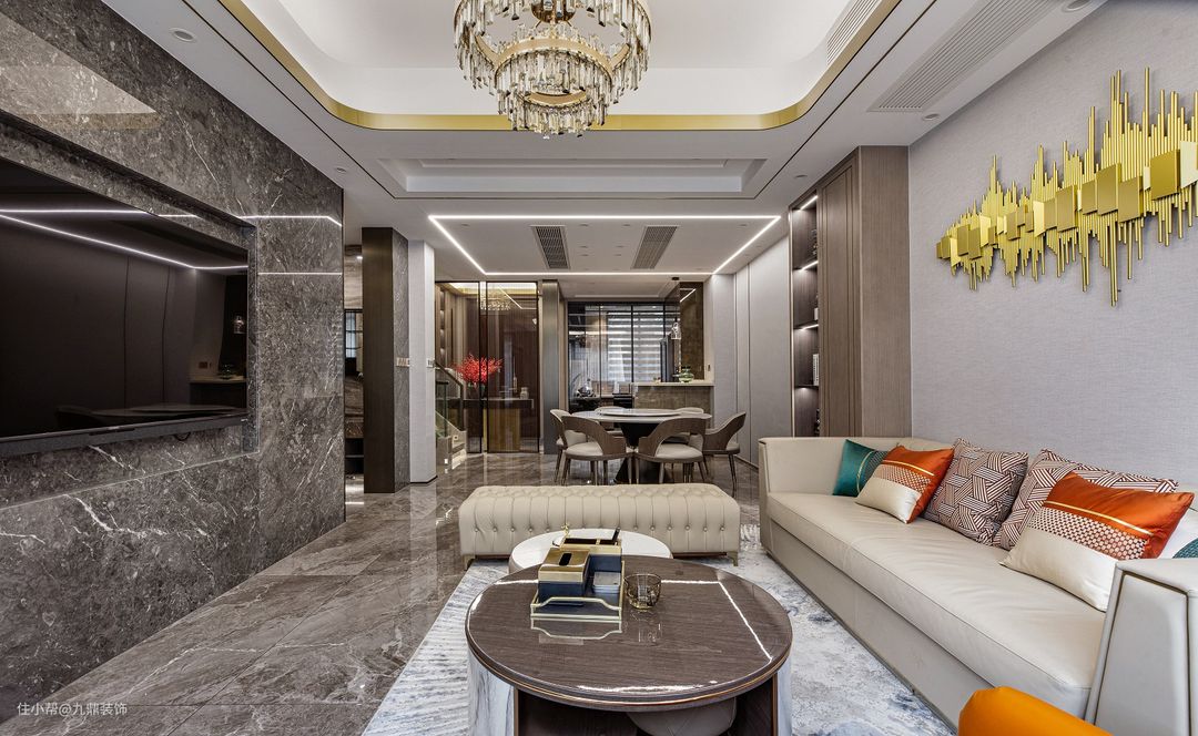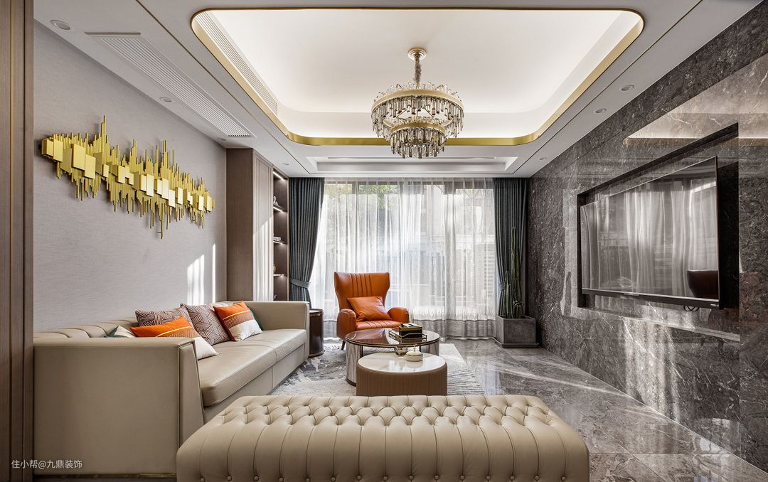 客厅的主要色调以米白色为主,米色的沙发,搭配一些彩色的靠垫,告别单调。深灰色大理石作为电视背景墙更显奢华。地毯是柔软的浅灰色,一刚一柔,一冷一暖,让整个客厅看起来更加和谐。墙壁上金色的装饰品,为空间增添了贵气。橙色的单人沙发点亮了整个空间,橙色减少了灰色带来的沉闷,灰色又降低了橙色的轻佻。合理的色彩搭配让空间舒适时尚。客厅背景墙打了两组柜子,可以摆放装饰品和收藏品。