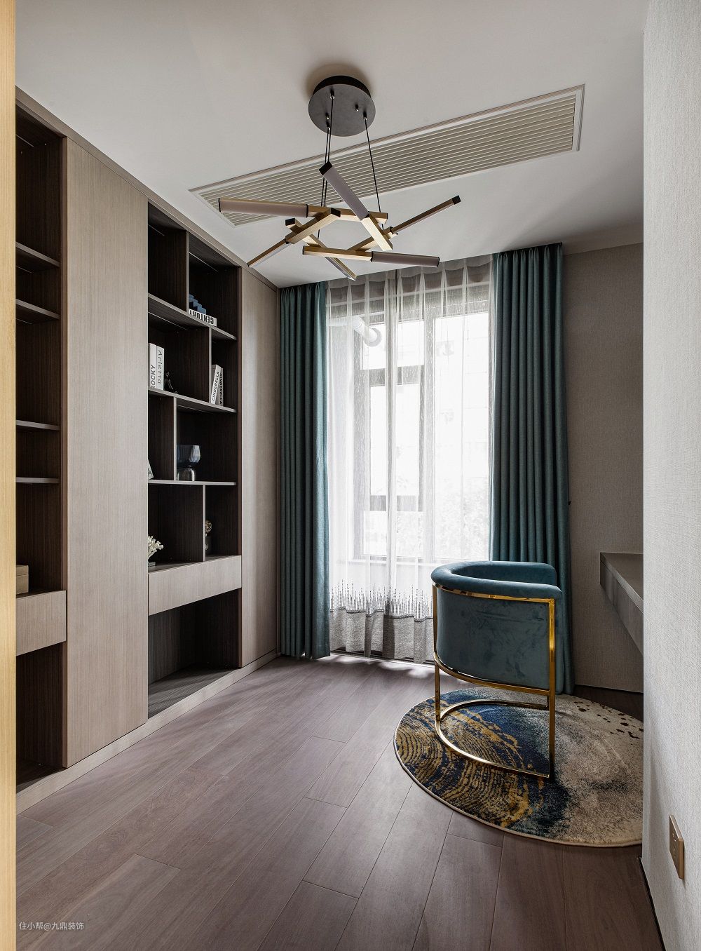 不同于主卧的简约,次卧更加的活泼与明亮。蓝色与橙色的碰撞,让空间更加年轻时尚。深色的大理石砖,让空间更加沉稳。冷暖搭配,色调相宜。 二楼还单独设计了一个书房,方便孩子阅读学习。