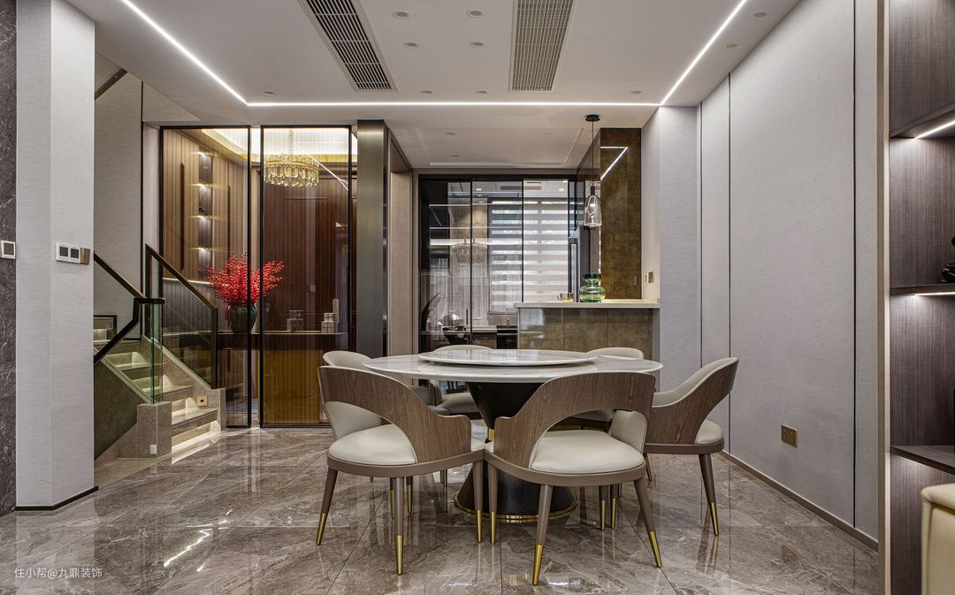 餐厅的墙面选用了和客厅一样的浅灰色,柔和的色调可以中和大理石带来的冰冷,营造出更加温馨氛围。白色大理石质感的餐桌,搭配同色的柔软皮面木椅,让主人在用餐的过程中享受到更加舒适的感觉。餐厅的灯光设计了流线型的吊灯,让整个空间更加柔和浪漫。