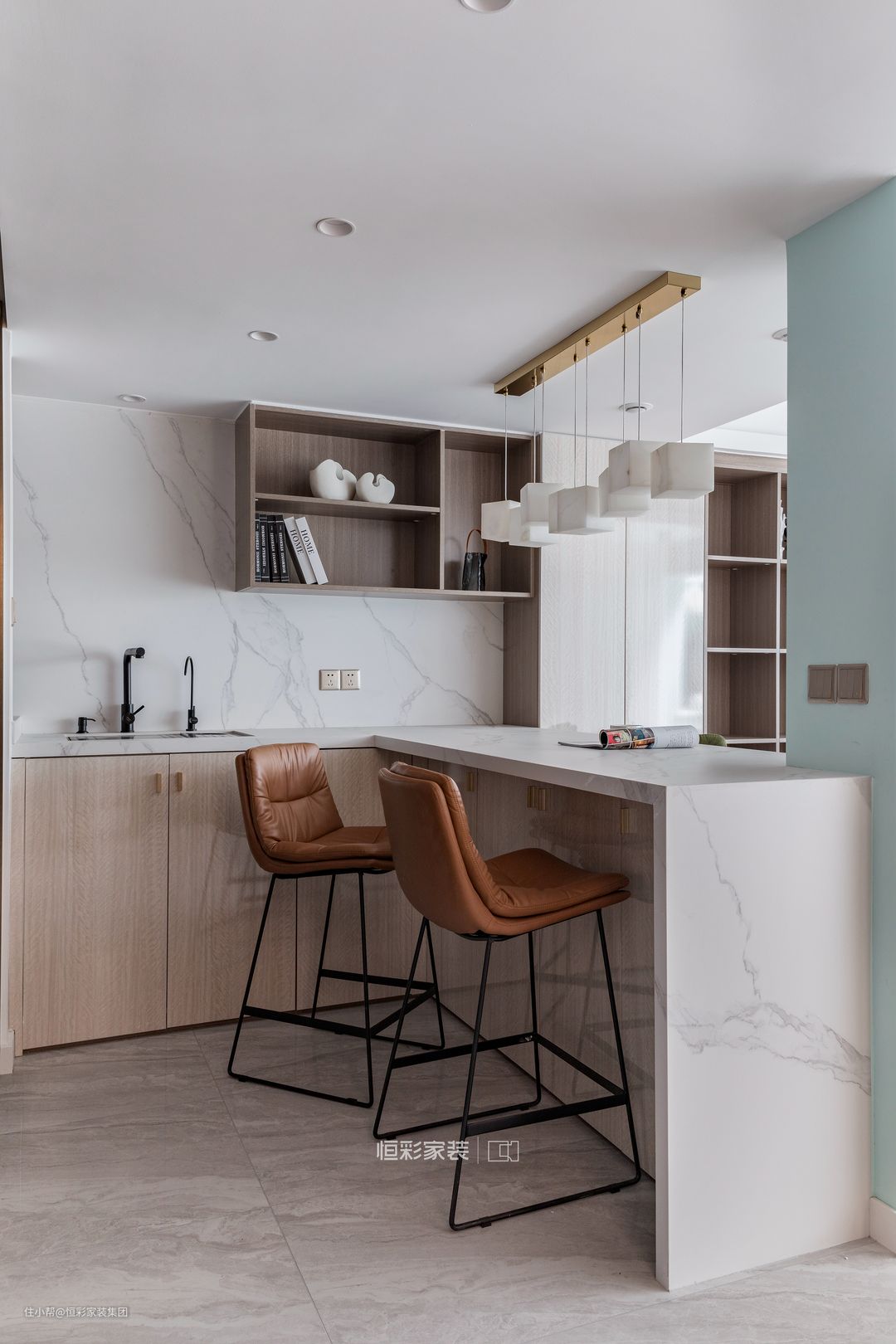 大厅靠近厨房的空间设计成西厨区+吧台,核心区是操作台,墙面是与吧台同款的岩板,天然石纹凸显磅礴气势。