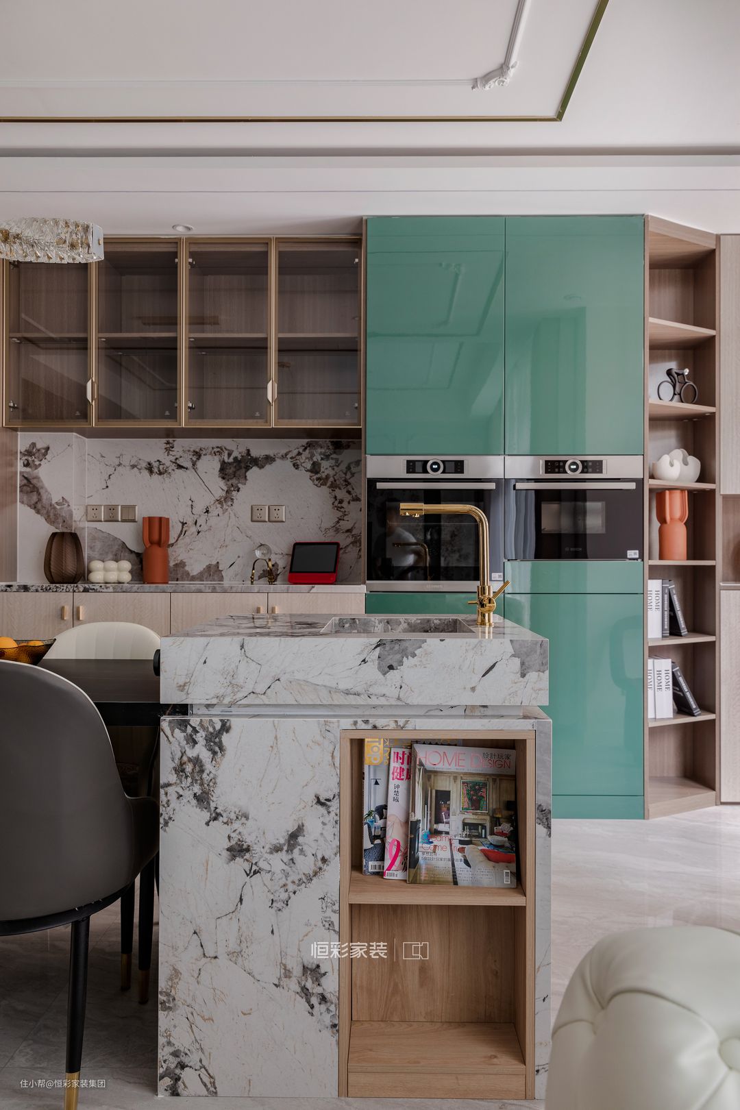 复古绿亮面柜将冰箱隐藏起来,另一面同样是复古绿亮面柜将蒸烤箱做嵌入式设计,两面形成对称设计,精致优雅。