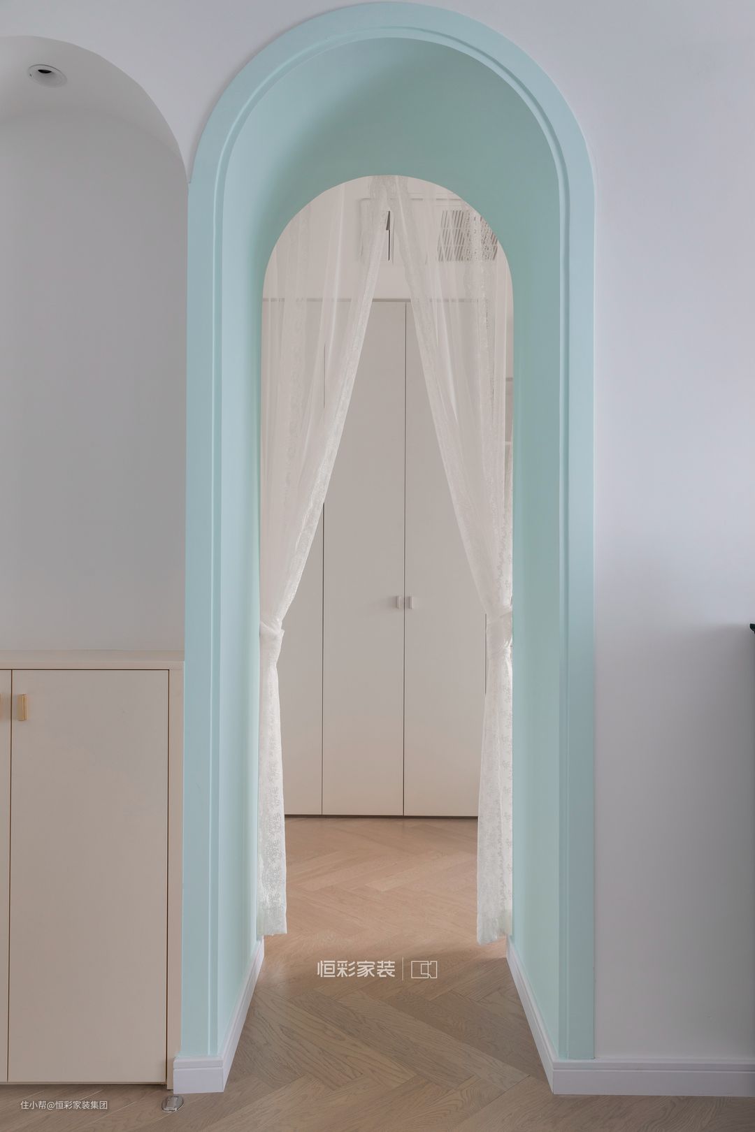 三楼衣帽间的门洞也做了一些小设计,两扇拱形门一虚一实,形成美妙的对称。衣帽间内还有梳妆区、浴缸,女主人拥有了每个女生梦想中的超大衣帽间。 浴缸吊顶做了天窗设计,边享受泡泡浴边观赏夜景也是一种闲情雅致。岩板上墙延伸到浴缸区,岩板天然纹理的大气感与整体呈现的优雅精致碰撞、融合。梳妆区定制吊柜增加收纳。