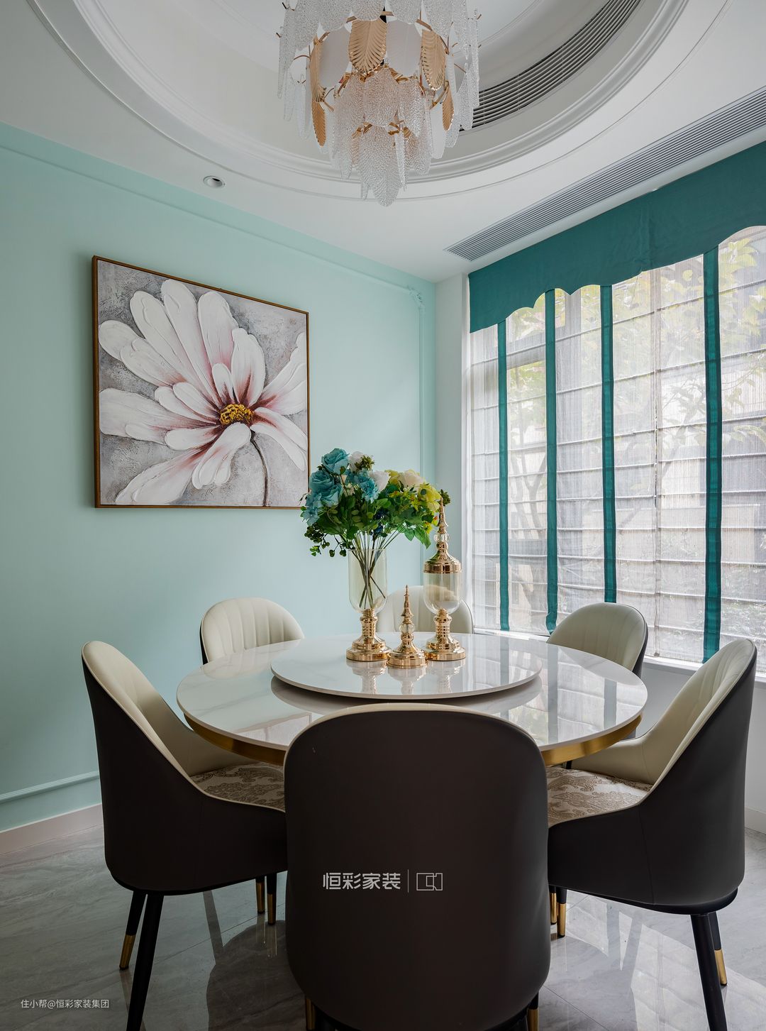 轻奢风的餐桌椅,搭配蒂芙尼蓝的背景墙很好地展现独特魅力,焦蓝色绣球花与雕花设计也展现出浪漫的法式风情。