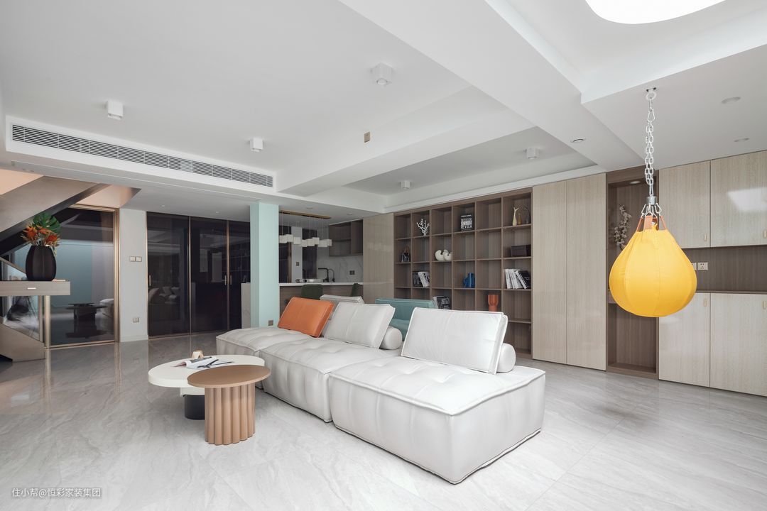 投影墙做了拼色处理,蒂芙尼蓝做底,拼接石膏板上白色底漆,清新拼色打造优雅摩登的视觉感。作为全功能的休闲区,甚至还有专用的儿童水球沙袋,这里也成孩子的专属居家拳馆。 影音厅一角设立吧台区,坐着高脚凳喝一杯饮料,另有一番情趣。大理石台面与墙砖浑然一体,轻奢感立现。