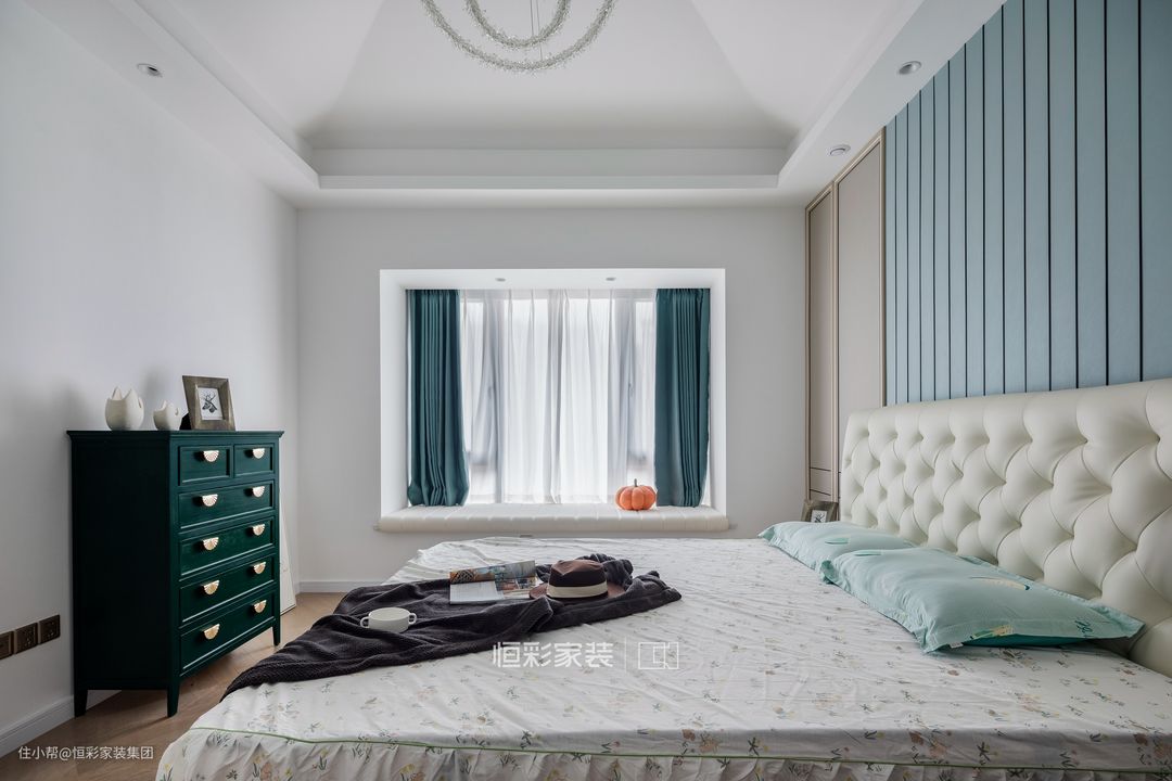 三楼主卧做了一个大套间设计,给屋主创造了一个独立空间,私密性更佳。主卧挑空设计,超高层高带来大气高雅的视觉感受。卧室配色与动区呼应,大面积的蒂芙尼蓝背景墙奠定浪漫底色,小范围复古绿点缀复古情怀。
