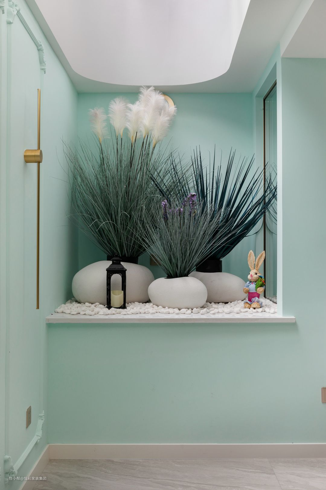 负一楼整层以休闲娱乐功能为主,中心大片区域作为影音厅,四周辐射设立收纳柜、吧台、桑拿房。 两组沙发背靠背放置,或观影或看书,悠然自得;地下室承担整屋主要收纳功能,除了有专门的储藏室,还定制了整面收纳柜&展示柜,尽头的镜面设计让空间有了延伸。 投影墙的氛围灯独具匠心,嵌入式的月球石膏壁灯自带梦幻滤镜,预埋式样无边框安装更是巧妙(拍摄时未开月球灯,开灯效果可参考视频)。另外,石膏板背部也增加了灯带,共同烘托若隐若现的浪漫氛围。 原天井处因地制宜开了一扇天窗,顶部做圆弧处理,天窗下则被设计成端景区,旅人蕉沐浴天光,在蒂芙尼蓝包裹下更显精致,还原自然生态。