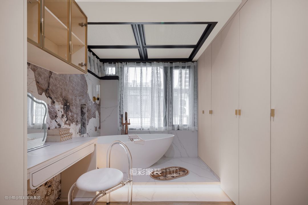 不管是异形云朵梳妆镜、网红椅,还是浴缸区充满少女感的遮光帘,都体现了女主人优雅从容的生活态度;