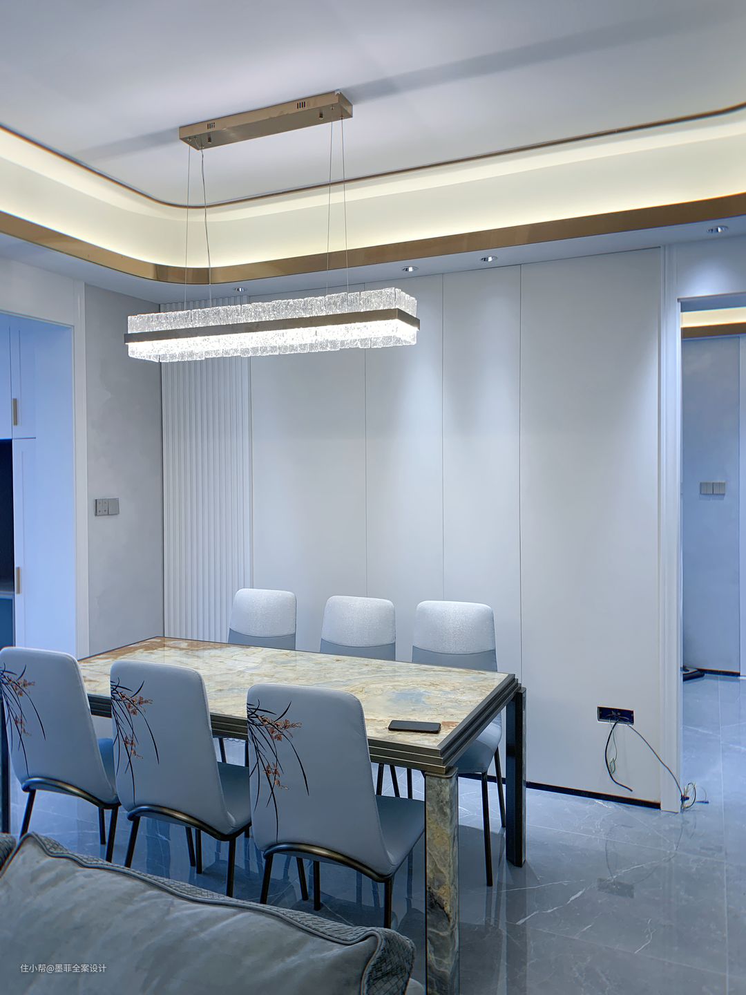 餐厅与客厅形成一体化的设计方式,空间感十足,开放式的布局让整个空间更显通透明亮。天花板做了圆弧处理,金属收口,护墙板也有了和客厅一样的风格,就是为了给户主留一点自己的创作DIY的空间。