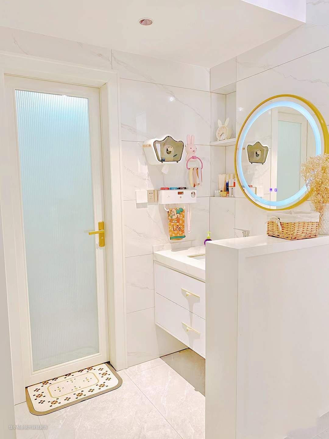 卫生间一分为二,干湿分离的设计超方便,里面的人使用也不耽误外面的人使用。浴室柜是定制的,两层大抽屉,里面可以收纳很多东西,上面有一小块墙是凹进去的,就直接做了壁龛,可以摆放日常护肤用品,还有一些小东西, 直接壁挂收纳,这样台面清爽又干净。