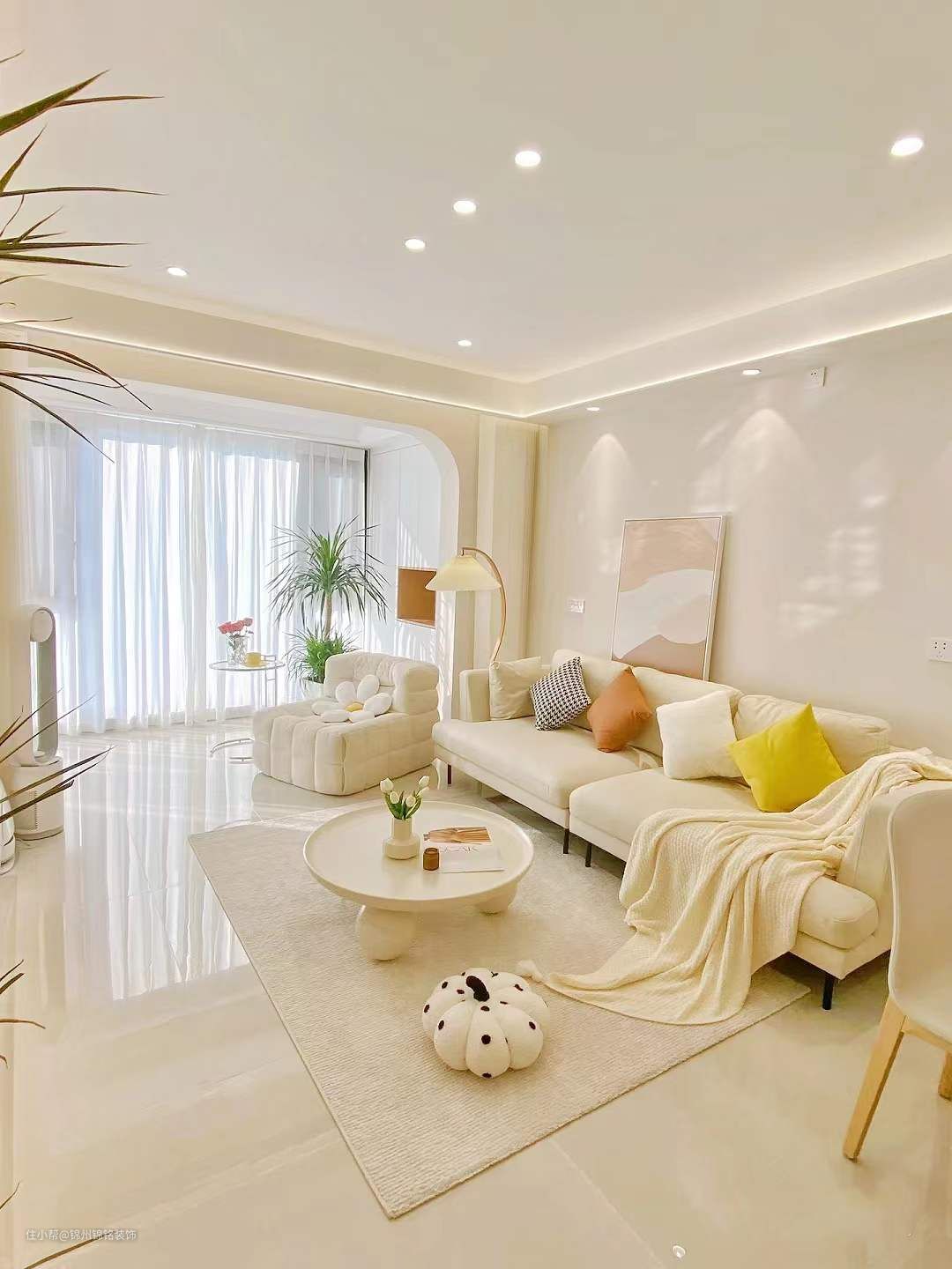 背景墙没有造型,小山丘射灯增加氛围极简悬空电视柜,客厅简洁好打理纯色奶油风地毯让客厅显得更温柔。家具尽量都选择浅色系,少数跳色作为点缀装饰画、抱枕、绿植丰富客厅色彩感+普通人的家也可以温馨又浪漫。