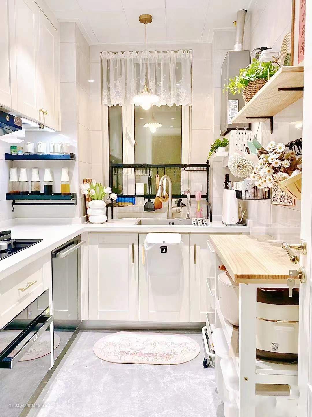 浅灰色地砖+灰粉色墙砖,美观也好打理,铝扣板吊顶,4个射灯+小吊灯直接氛围感拉满。U型厨房,根据洗菜、备菜、煮菜、装盘的做饭顺序布局。另一侧放置物架收纳物品。橱柜黄铜拉手,柜门实木多层烤漆,干净易打理。水槽上装了沥水架,拿取碗盘很方便 。右侧上面放了实木隔板,下面定制了移动置物架。