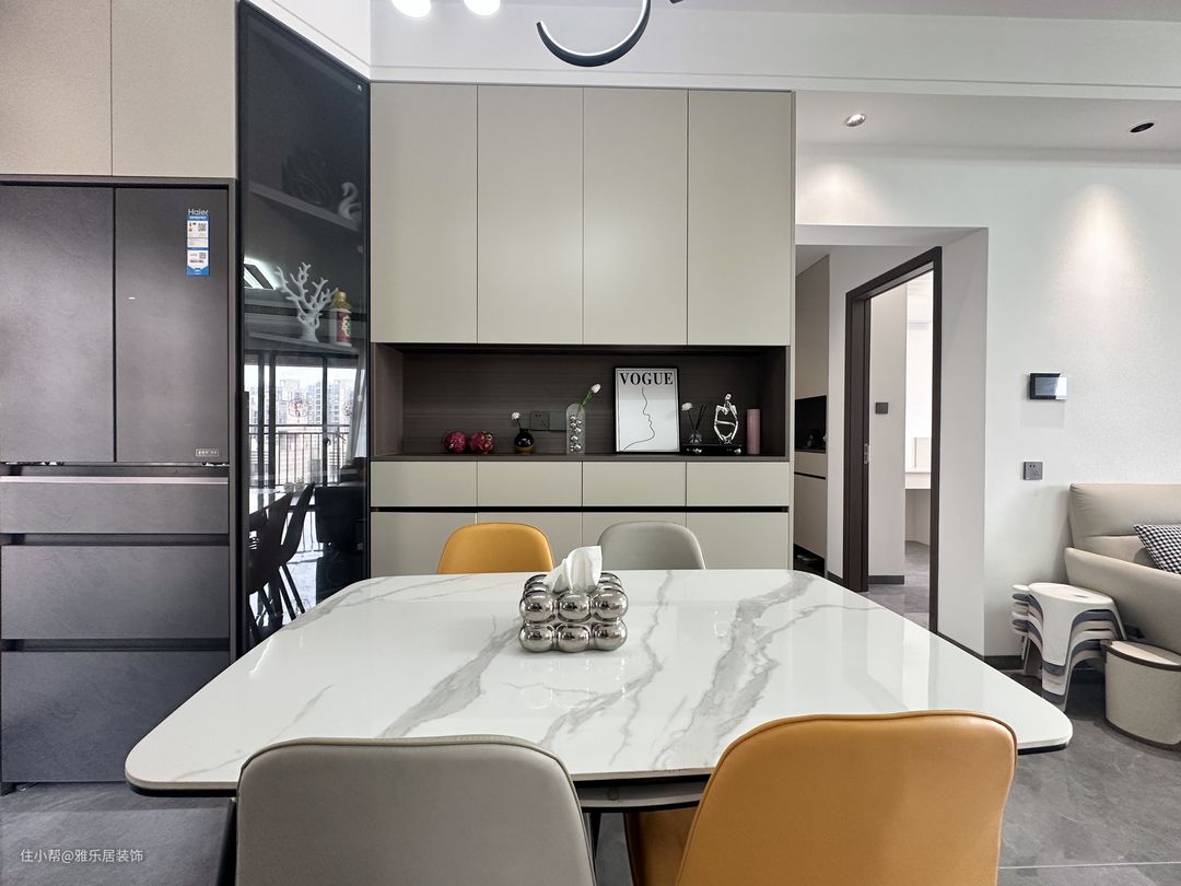 过道起到分割延伸的作用,视觉效果自动划分两大功能区,白色岩板餐桌搭配撞色餐椅,简约不显沉闷。