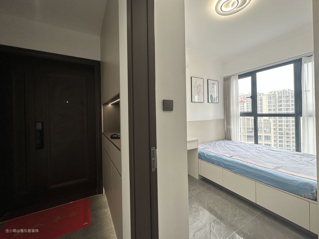 进门的左手边打造成玄关鞋柜,整体采用精灵灰柜门无拉手设计,中间留出的柜台可以放置摆件等小物品,干净利落又不失家的温馨感。