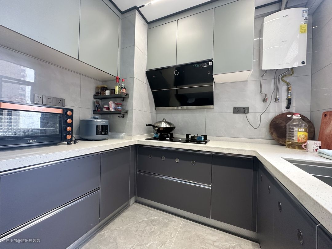 厨房设计成U型结构,同样延续了客厅的黑白灰,上下双层橱柜增加储物空间,高低错落的搭配设计更显时尚。