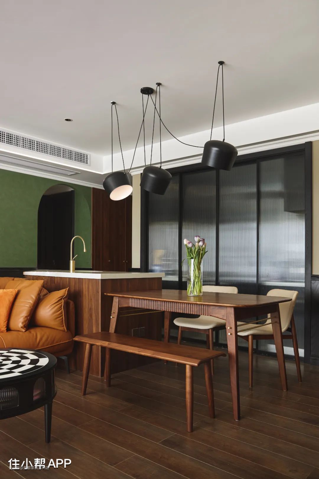把餐桌和吧台一字摆放,让餐桌吧台成为客厅的中心点,可以满足厨房做饭的补充功能,又能满足平时客厅日常饮水的功能。多功能餐岛一体,实木材质搭配精巧细节构造,打造协作型社交中心,高低交融的新空间格局。过道是民国风的护墙,表面黑色开放漆,圆弧包边,与墙面艺术涂料对比鲜明,带来岁月沉淀的安全感。