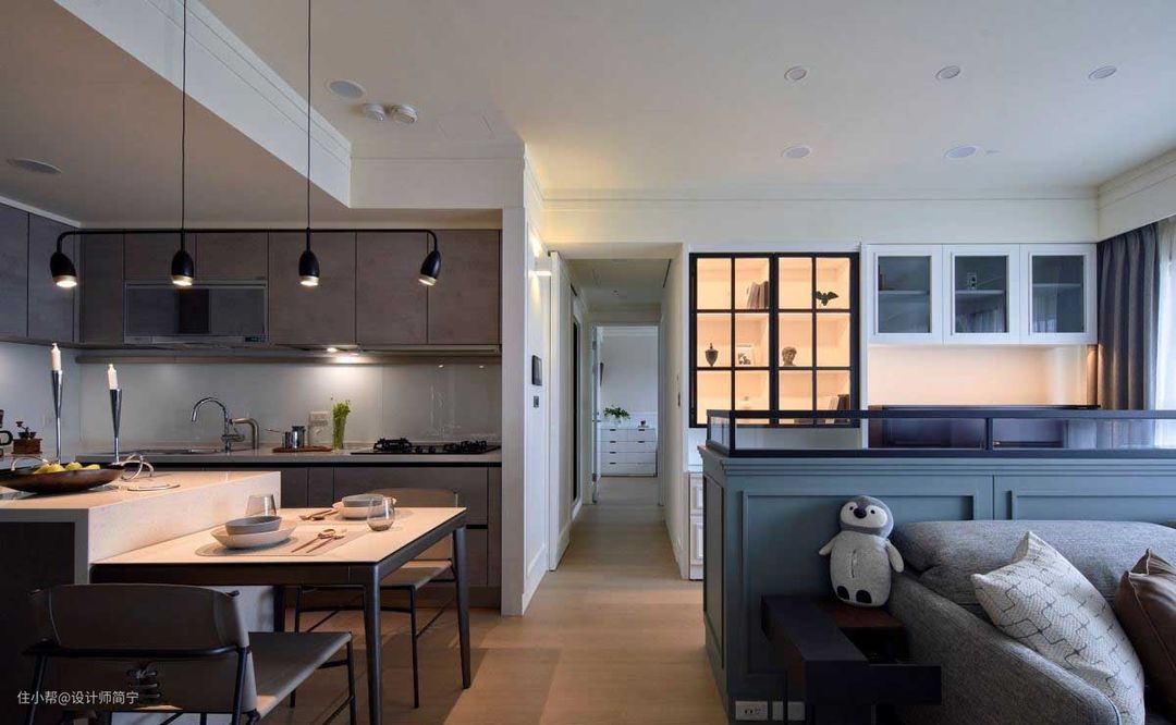 开放餐厨空间里融入中岛设计,实现屋主渴望拥有欧美大宅里开放式厨房的梦想; 中岛串连餐桌拉出流畅动线,并选配嵌入式电器柜、冰箱及电器收纳,再搭配伸缩式餐桌,仿佛置身在义式餐酒馆里,尽享优闲时光!