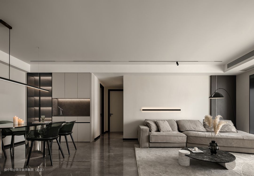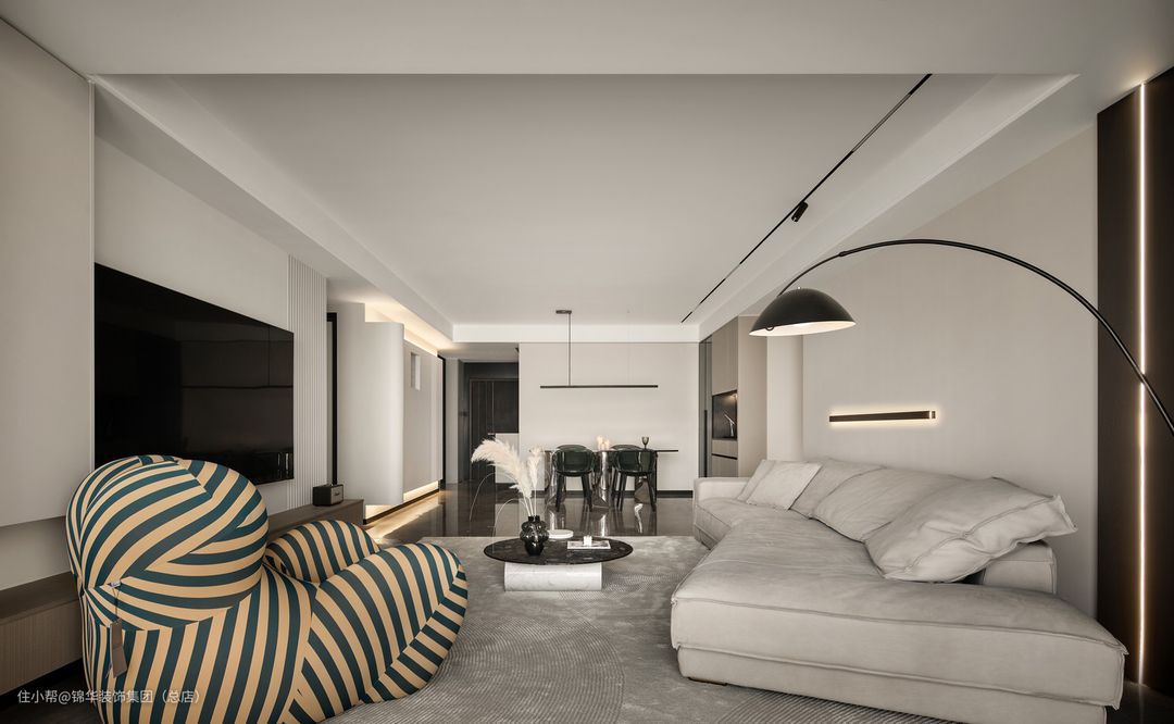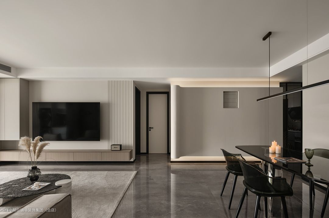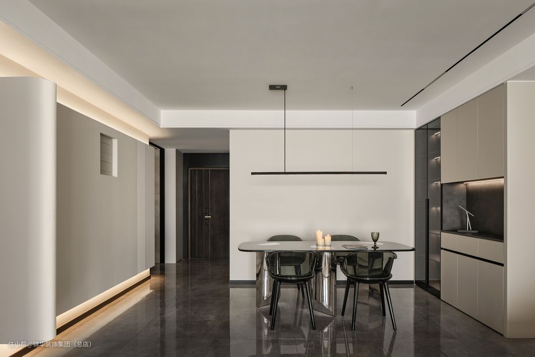 入户玄关,正前方视线顺延,墙面弧面造型,无形之中打破了穿堂的风水之说,无意间增加了玄关的空间感,又丰富了餐厅区域的立体感。没有过多的装饰,点线面的构架,一箭三雕。 家里主要的色调以“黑白灰”为主,客厅无主灯设计,墙面浅色为基础,加入一些隐藏灯带,部分驼色点缀。整个空间,钓鱼灯的弧形立杆、加上黑色透明餐桌椅的弧形边角,又与墙面造型呼应,打破了“黑白灰”极简的单一性。
