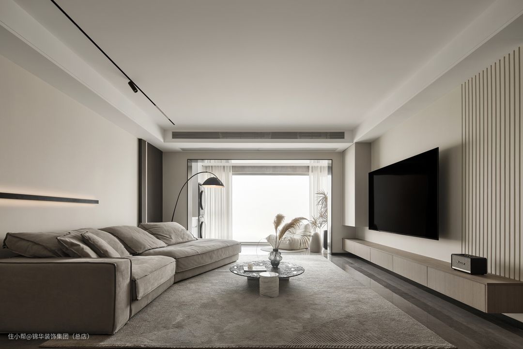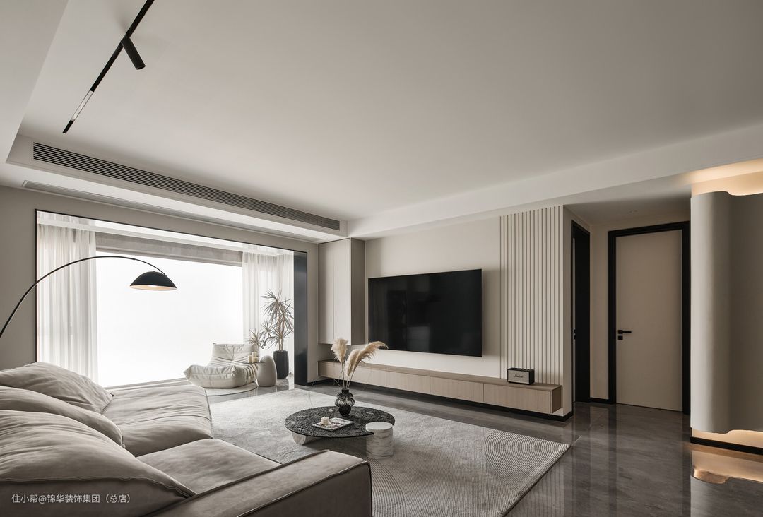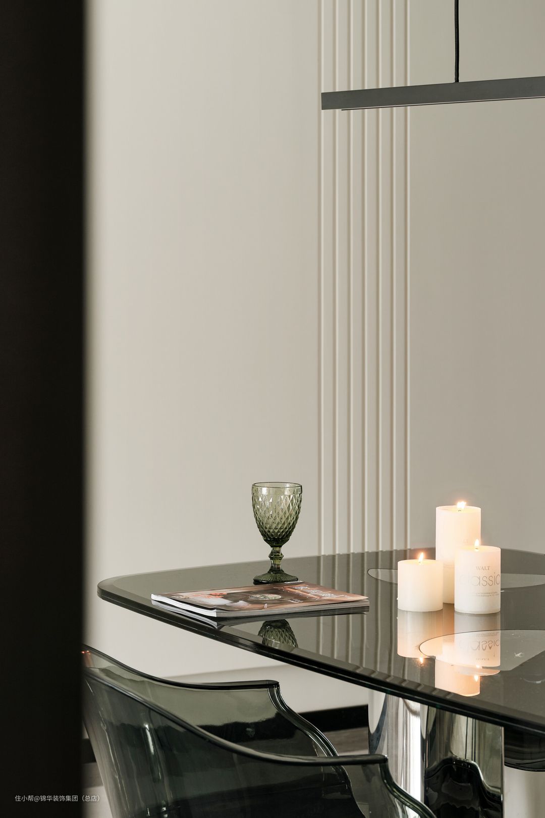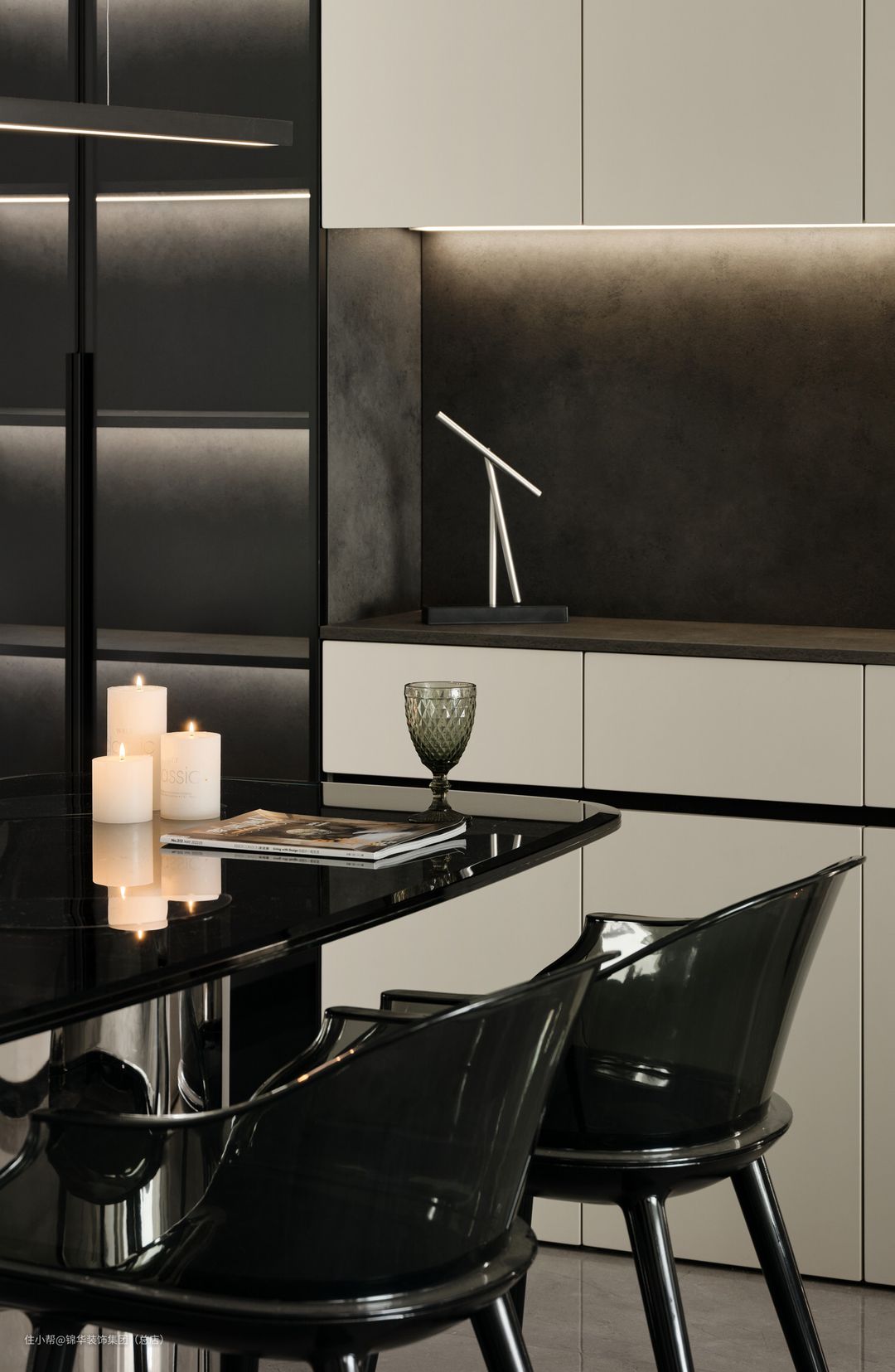 入户玄关,正前方视线顺延,墙面弧面造型,无形之中打破了穿堂的风水之说,无意间增加了玄关的空间感,又丰富了餐厅区域的立体感。没有过多的装饰,点线面的构架,一箭三雕。 家里主要的色调以“黑白灰”为主,客厅无主灯设计,墙面浅色为基础,加入一些隐藏灯带,部分驼色点缀。整个空间,钓鱼灯的弧形立杆、加上黑色透明餐桌椅的弧形边角,又与墙面造型呼应,打破了“黑白灰”极简的单一性。