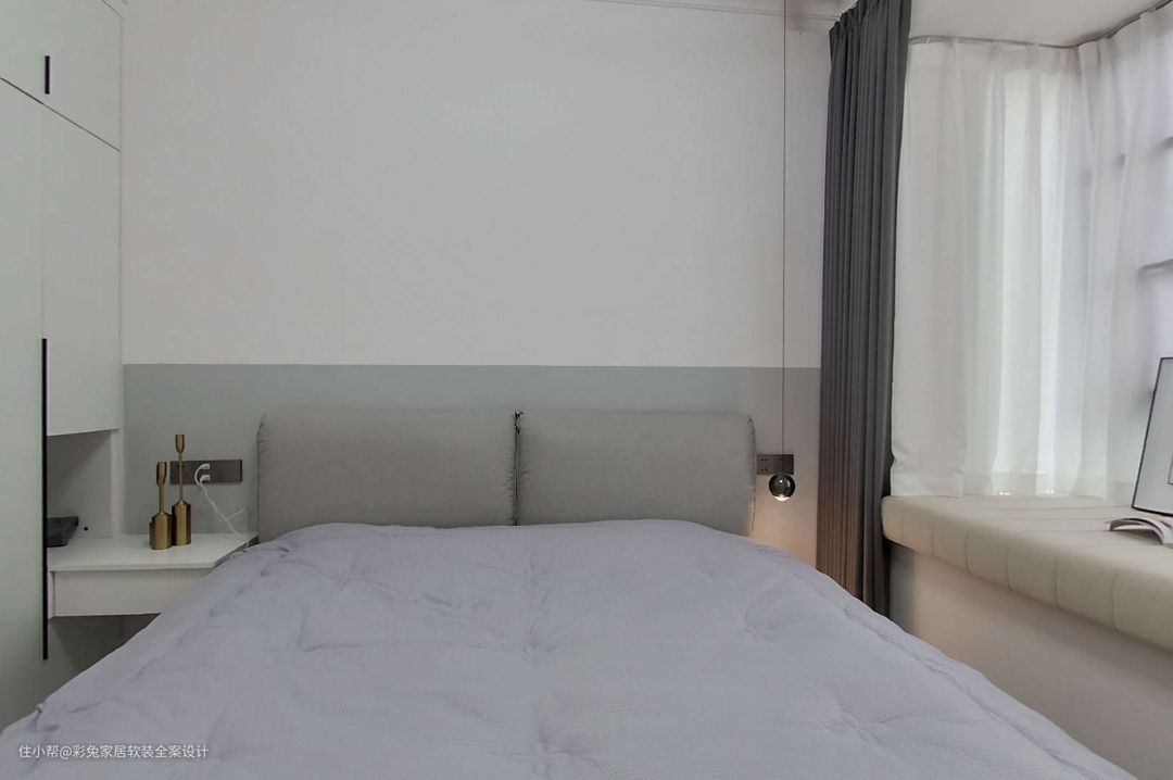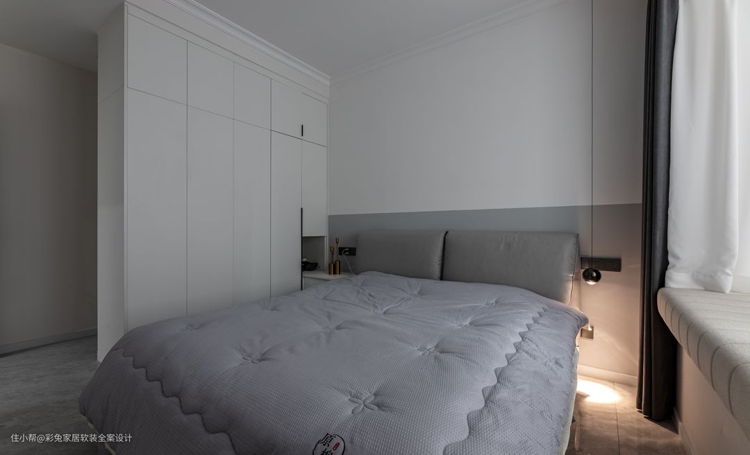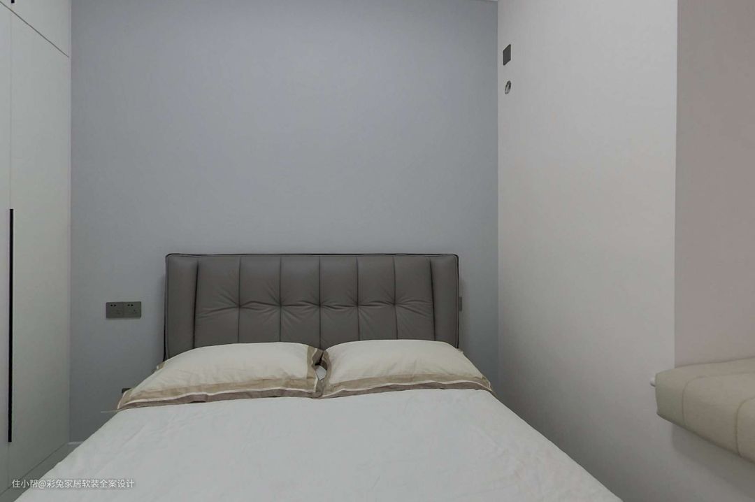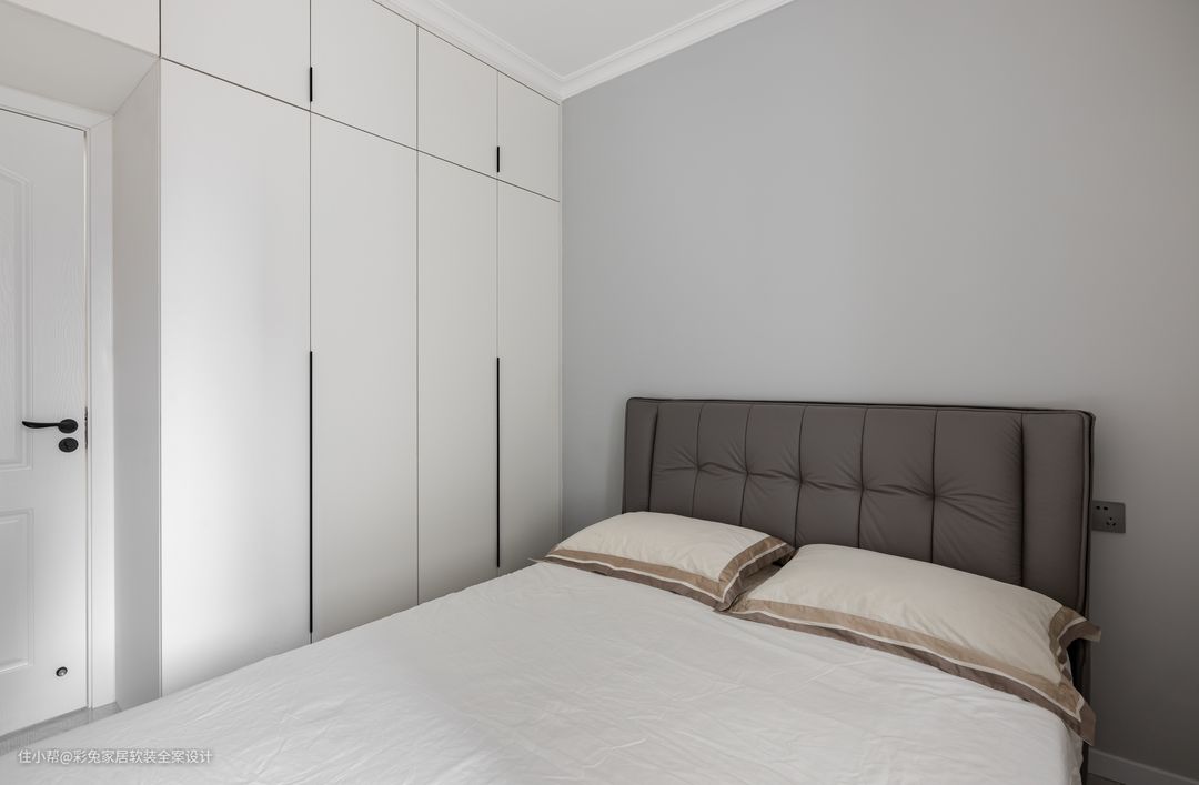 主卧建转角的衣橱,增大了收纳空间,同时避免主卫生间对床开门的尴尬。衣橱到顶设计,米白柜体和墙面颜色一致,隐形拉手大气简洁。 主卧选择浅灰色软床,与地面瓷砖颜色相协调。营造清爽优雅的休息空间氛围。床头柜和衣柜一体打造,节省了空间,也增添了不少方便。