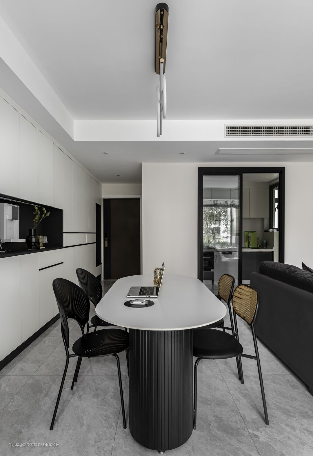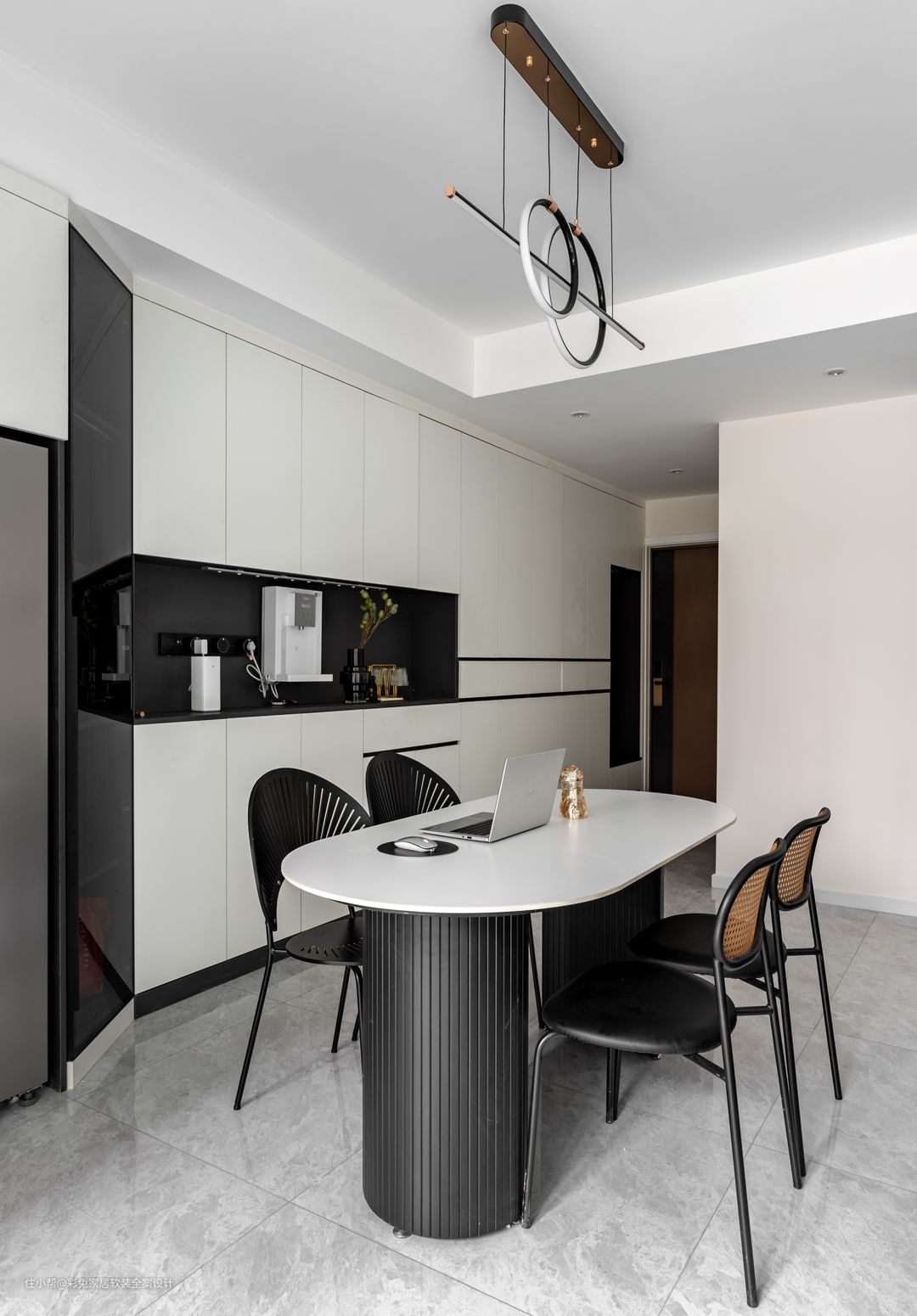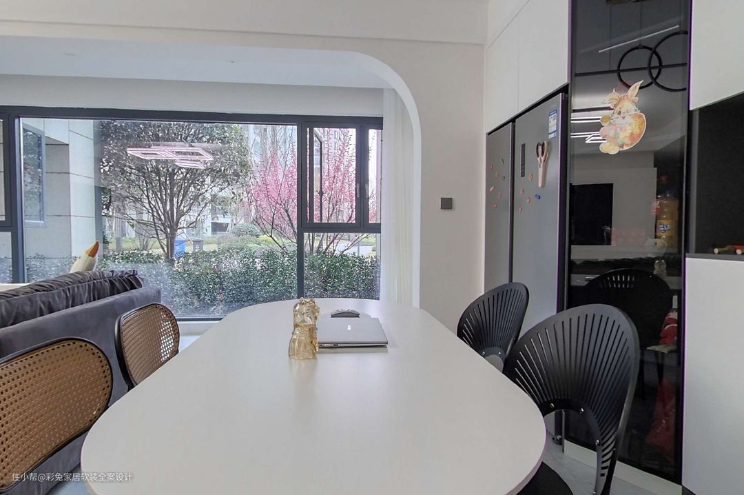 餐厅和客厅一体打造,空间更加通透明亮。顶面做部分吊顶,隐藏空调设备,同时为走道与客餐厅做出空间划分,给人更和谐的空间秩序美感。 客餐厅地面通铺800*800mm浅灰色亮面地砖,让空间更加明亮。浅灰地面与家具的黑色线条建立了清晰的对话,对比中,呈现出一个明朗清爽的空间观感。 餐桌选择白色岩板桌面,弧线造型的长桌1600*800mm大小,搭配曲线造型的餐厅吊灯,让餐厅空间变得更柔和。 餐边柜中段做成开放式壁橱,接入水管,壁挂直饮水机,方便取热水泡茶;餐边柜黑色面板和黑色的餐桌框架相对应,让餐厅空间更显简约精致。