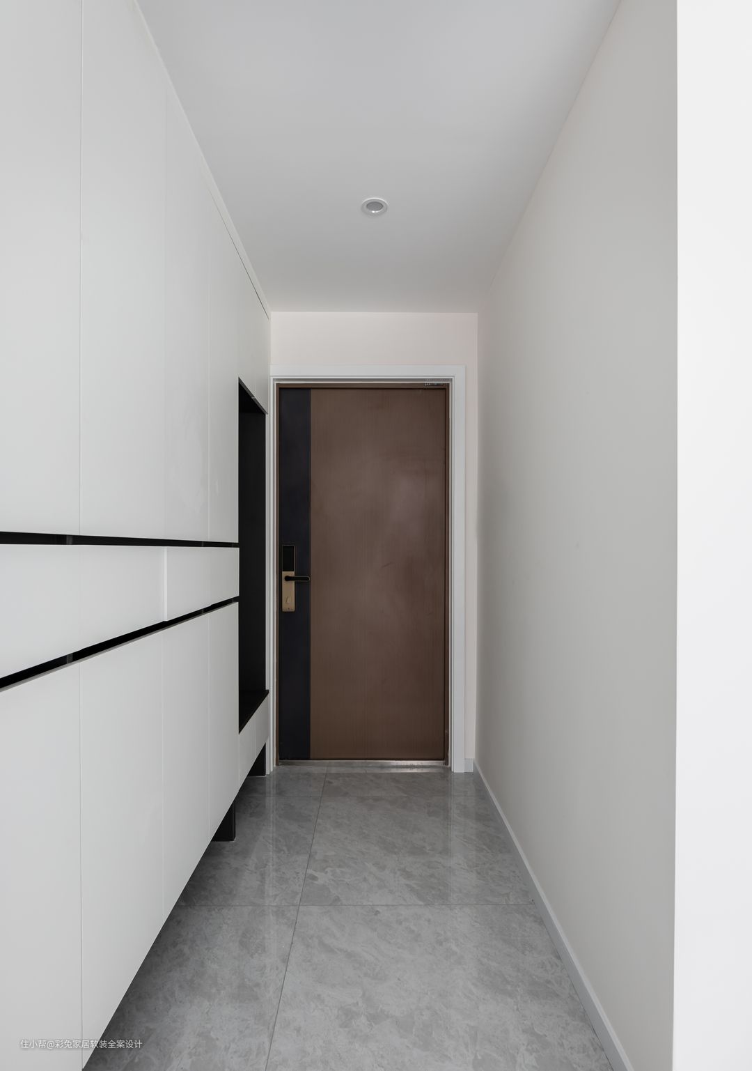 玄关走廊较短,于是将玄关柜和餐边柜一体打造,定制柜连同冰箱位置,共长6160mm,装点了客餐厅的整个墙面。白色无拉手柜门设计,让定制柜更好的融入空间,整体大方简洁。 玄关走廊,尺度为1780*1470mm,做石膏板吊顶,可以更好的接驳到顶的玄关柜;同时让人从入户的狭窄进入大厅的宽敞,这个过程会给人带来豁然开朗的体验感。