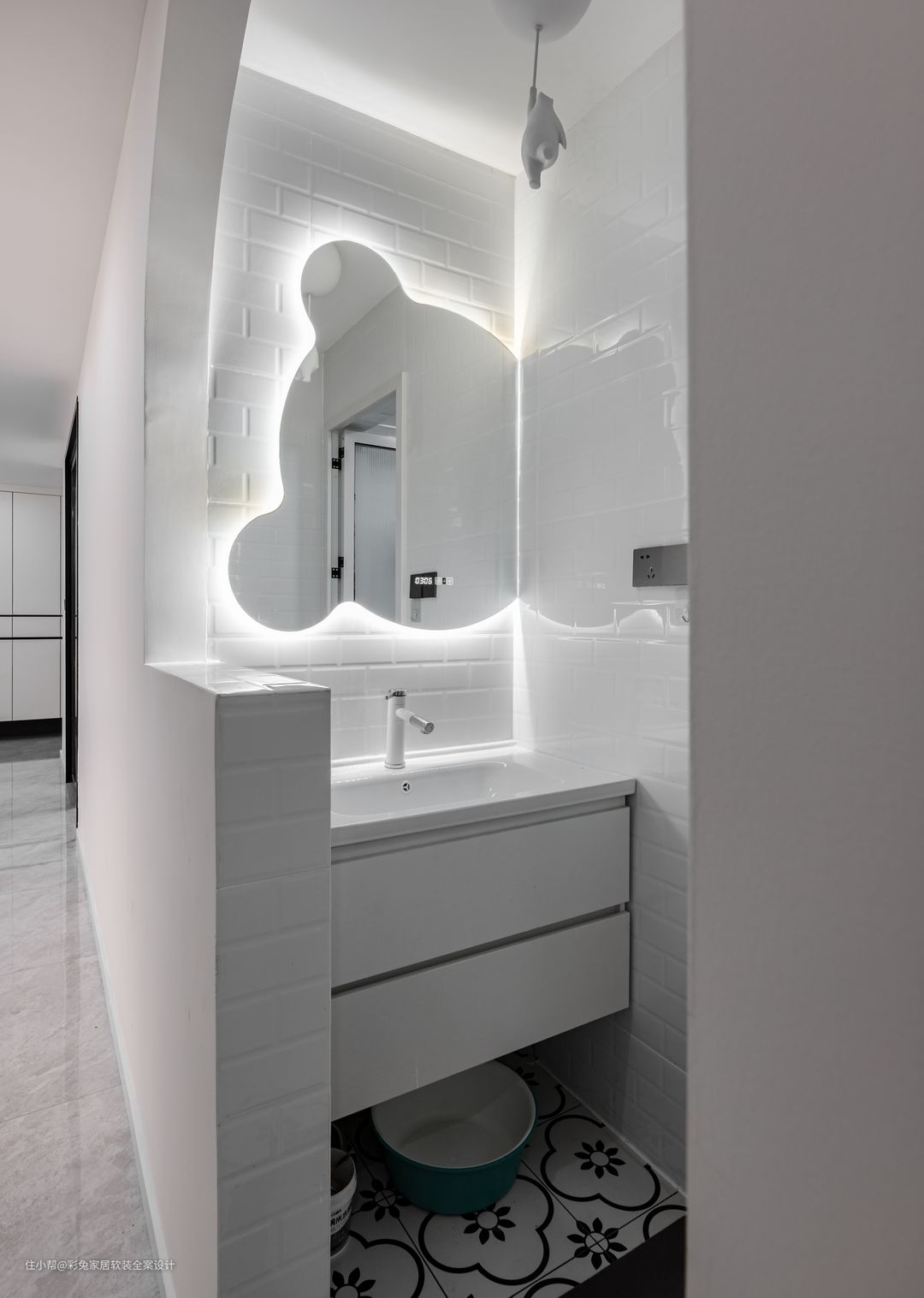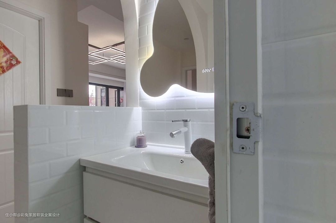 从客厅就能看到客卫,所以洗手台位置的装饰性也很重要,用拱形门来呼应客厅的整体柔和风格。 墙面铺白色瓷砖,地面铺黑白花纹小砖,营造活泼趣味的空间氛围,让家更加温馨。 墙面安装流线造型的智能镜,带有防雾、照明等多种功能,让护理时光充满乐趣。定制白色一体陶瓷台盆,表面光洁无缝更方便打理卫生。吊柜抽屉方便收纳护理用品。