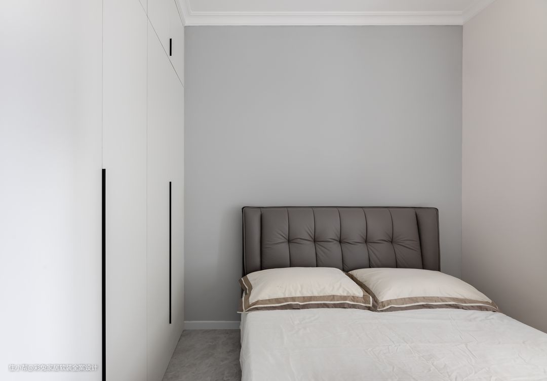 次卧靠墙做整体衣橱,更多利用墙面空间做收纳,衣橱尺寸1855*600mm,选白色柜门搭配隐形拉手,降低存在感,与墙面融为一体,空间整体感更好。 衣柜与床之间留550mm宽度的过道,足够开柜门。