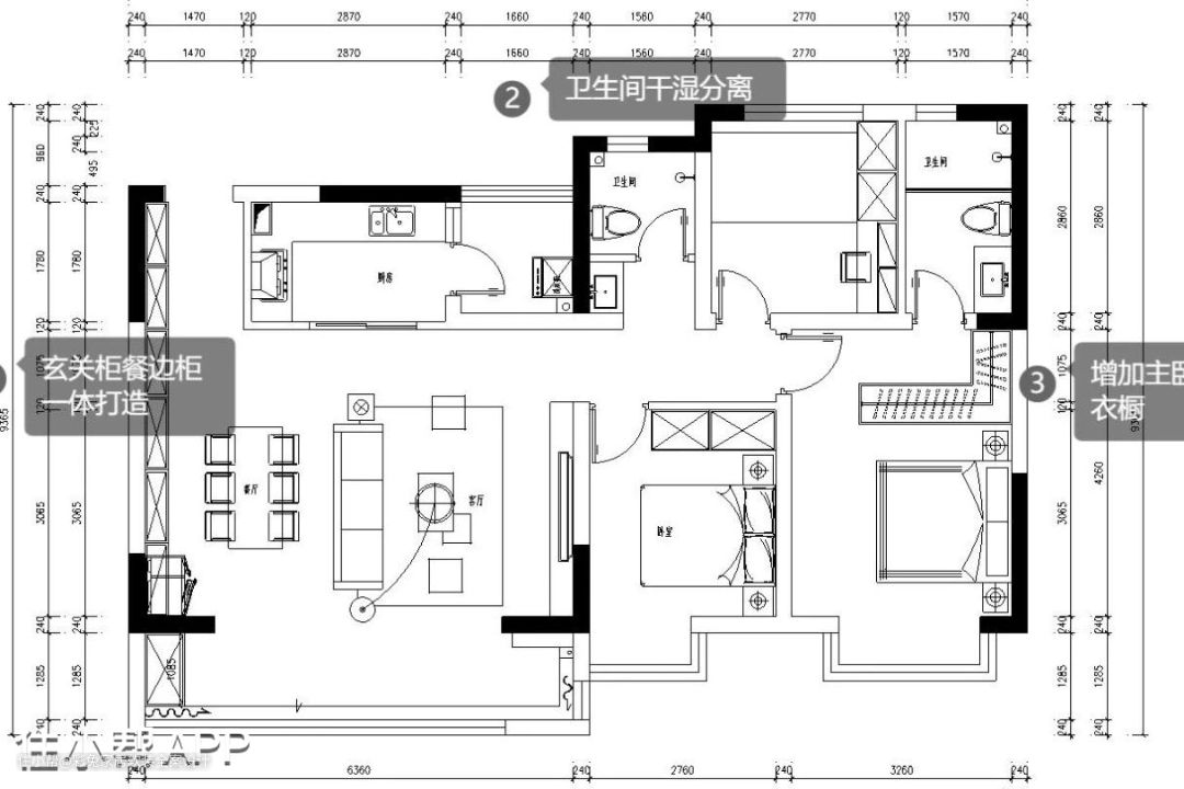 改造后: 通过改造,玄关柜和餐边柜一体化设计,让客厅的收纳力得到提升;客卫做干湿分离,更方便使用了;三间卧室都增加了定制柜,充分利用空间,增加收纳。