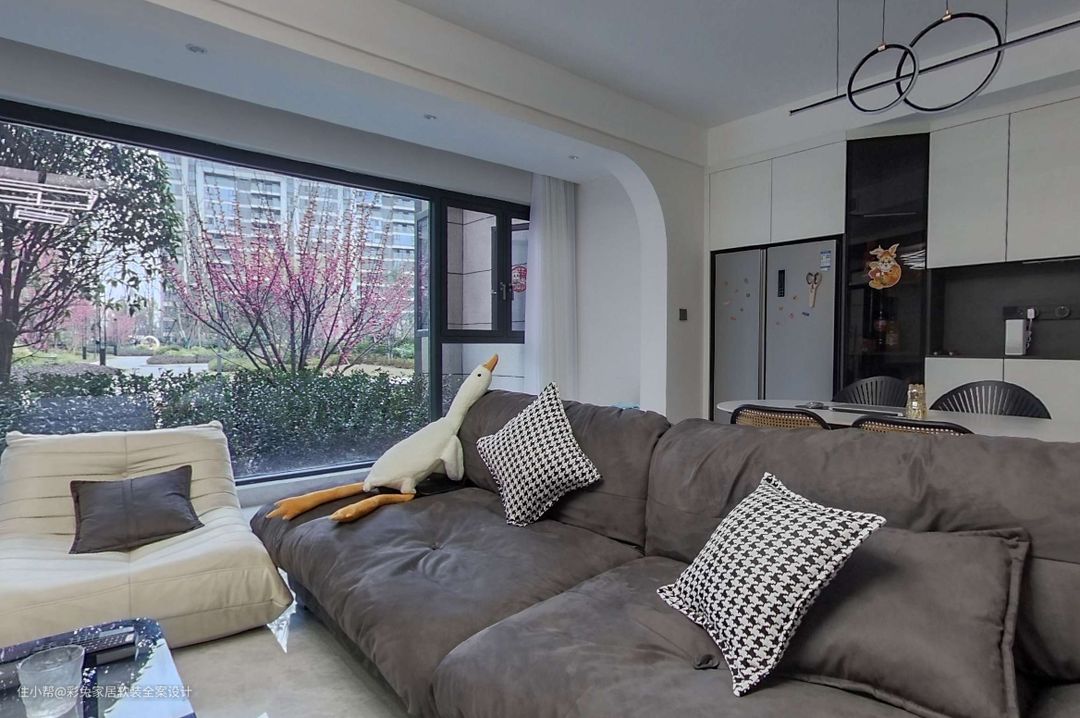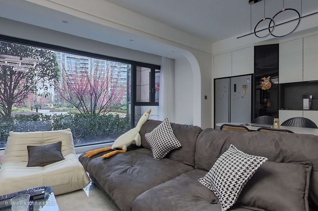 客厅用奶油色墙漆和弧线造型来修饰空间,营造温和甜美的空间氛围。电视墙做悬浮造型,转角做弧线,与阳台的垭口相接,给人更舒适柔和的空间感。 100寸平板电视嵌入墙体,严丝合缝的精致感让人倍感舒适。 电视墙下方定制吊柜,用一排抽屉满足小物件的就近收纳。客厅中央用几何造型的黑色吊灯,与茶几相呼应,丰富空间表情。 客厅选深色布艺沙发,为以浅色为主调的空间增添了沉稳气质。沙发背靠餐厅摆放,成为客厅和餐厅之间的隔断,划分出清晰的功能分区,也让空间变得更加饱满丰富。 阳台落地窗保证了充足的自然光线进入室内,窗外就是小区绿化,四季风景如生动画卷,成为客厅最美的一面。