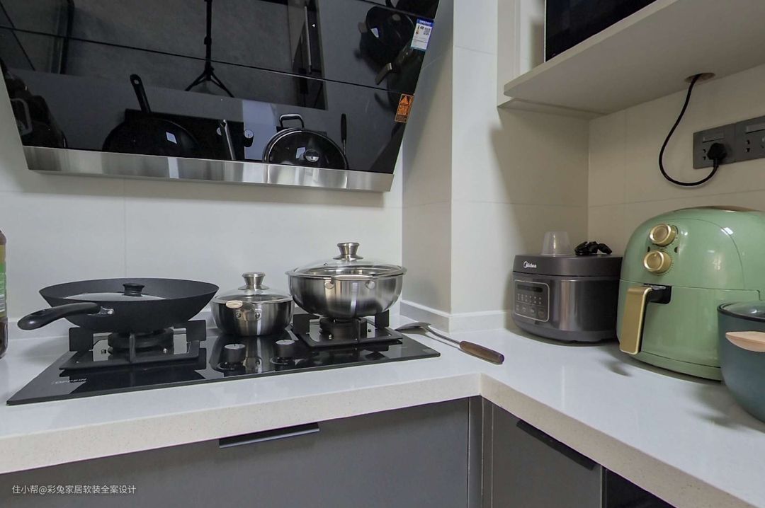 厨房和客餐厅之间用细边框玻璃门相隔,地面和客厅一体,通铺800*800mm大地砖,拉开玻璃门厨房空间变得更加通透宽敞。 厨房橱柜呈L型布局,长边有2270mm,作为水槽区和备餐区,白色石英石台面与白色墙面相搭配,空间更显整洁。 下方橱柜嵌入烤箱和洗碗机,享用更多科技化厨电,让生活充满便利。 灶台区域宽1180mm,下方做抽屉更方便拿取。厨房吊柜也采用无拉手到顶设计,充分利用墙面空间作收纳。