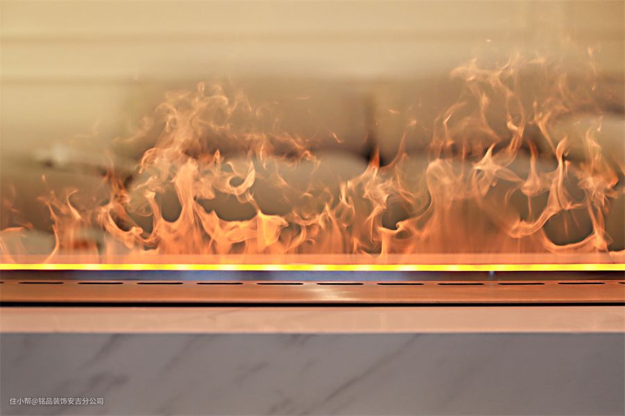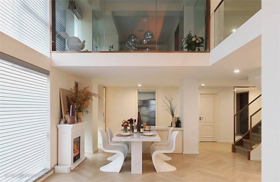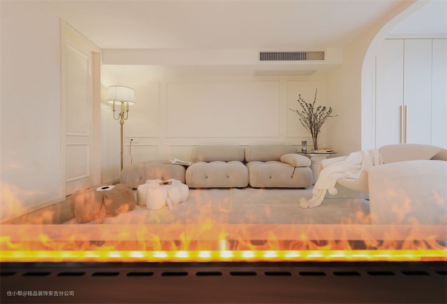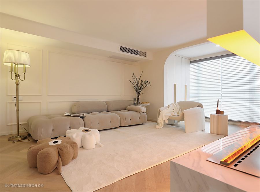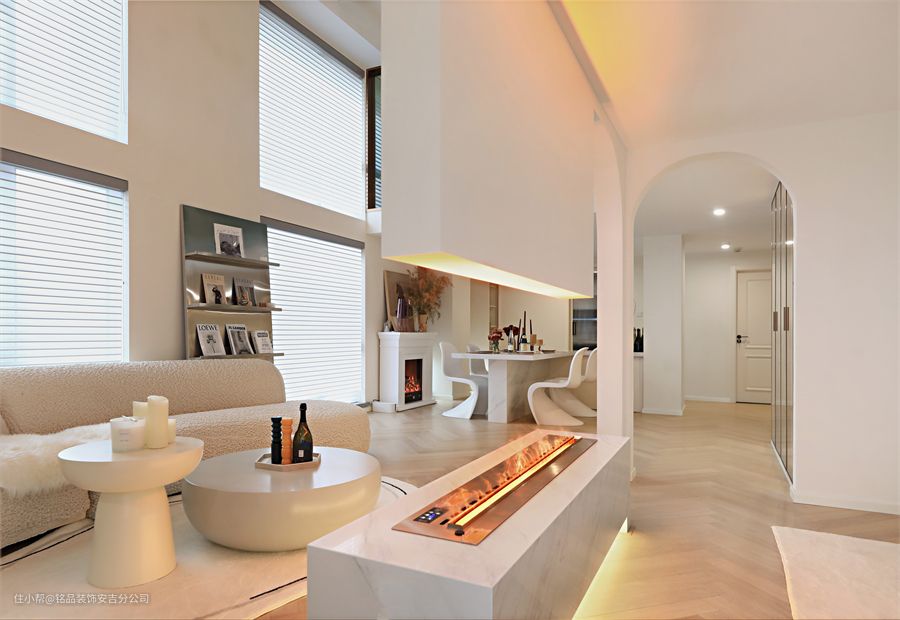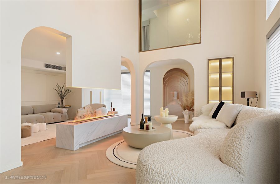 从客厅望向阳台,客厅里做了中央空调和新风系统,阳台做了一组收纳柜,墙面除了石膏线造型,还做了圆形拱门,更适配奶油系的风格。客厅是双客厅的设计,以电视背景墙为分割,将客厅一分为二 两个沙发采用对摆的形式,更显出空间的对应平衡从拱形门、置物书架到透明楼梯间,细节的点缀修饰了客厅的每个角落,让房间不再单一,也让空间变得充满艺术感沙发不受约束,无靠背的设计模糊了边界线,整个客厅显得更是一个整体,矮矮的茶几刚好考虑到可以坐在短毛地毯上,随性自如。台面上内嵌电子壁炉,轻盈又灵动,氛围感直接拉满