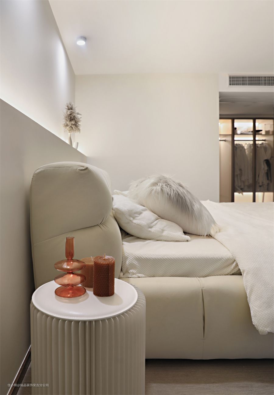主卧以大地色和奶油色为主,温柔又干净,让人有种治愈的感觉,奶白色靠背床,是容易清理的皮质材质,靠起来也很舒服,床头柜选了同色系的褶皱边几,更有造型感 床尾放弃了千篇一律的定制柜,选择了可移动的电视支架,只是占用了一个角落的位置,就能实现躺平看电视