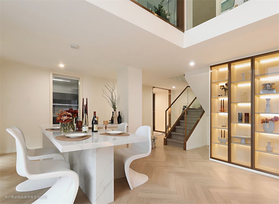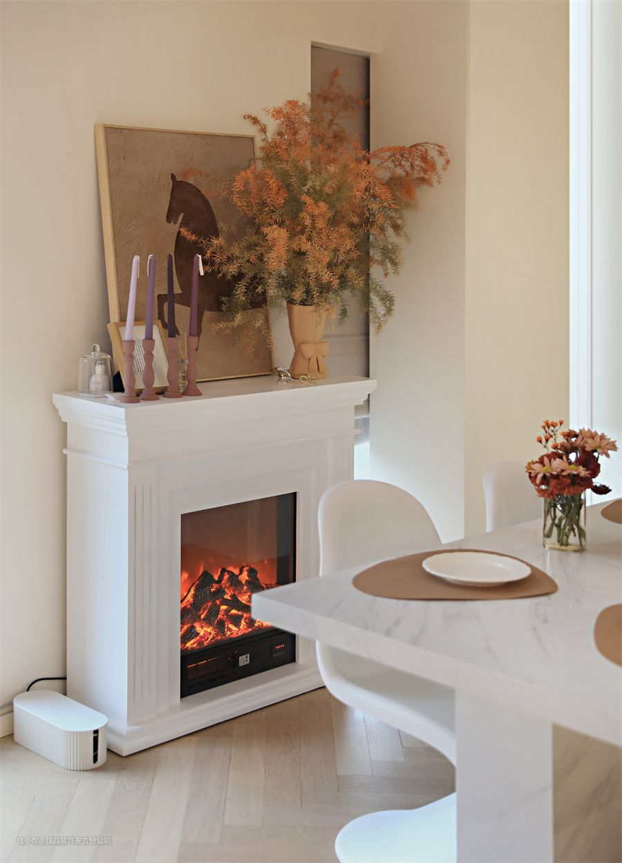 半开放式的餐厅和厨房融为一体,不再是一个背对全家辛苦劳作的空间,增加了许多与家人互动的时间餐桌选择了更加稳固的大理石餐桌,餐椅搭配了时尚的美人椅,圆角的设计更加安全,宽大的底部能够带来更强的承重性餐厅墙面处放壁炉,台面搭配装饰画和绿植,打造精致的一角。另一面墙做餐边柜,用透明柜门+格口+隐藏灯带打造为装饰柜,观赏性十足
