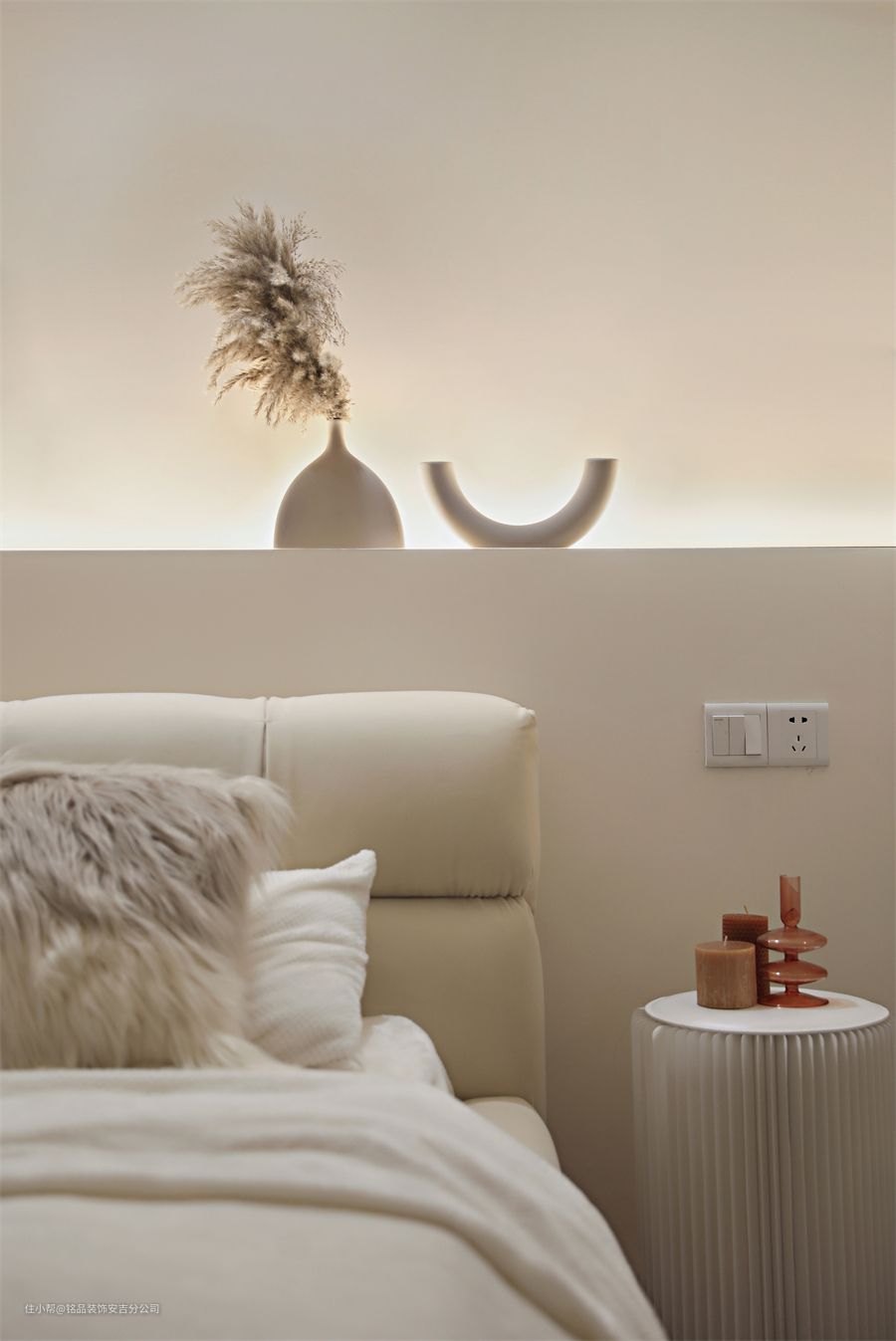 背景墙做了半墙的设计,内嵌隐藏灯源,轻松营造氛围感,留出的台面还可以用饰物作装点。床头柜是可旋转的抽屉,实用的同时又不失设计感