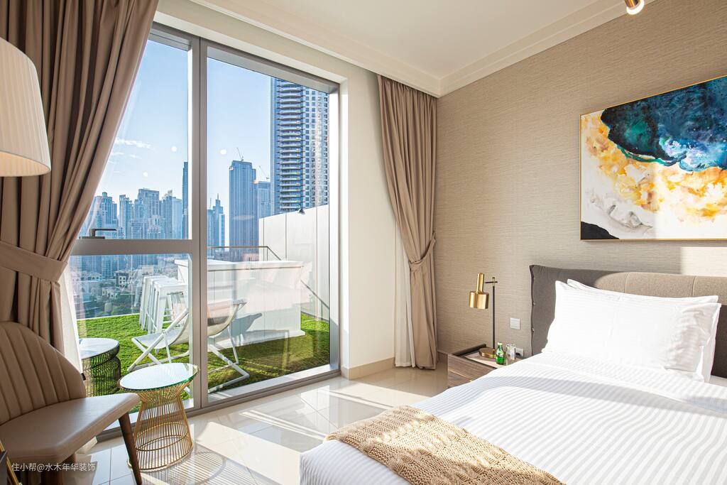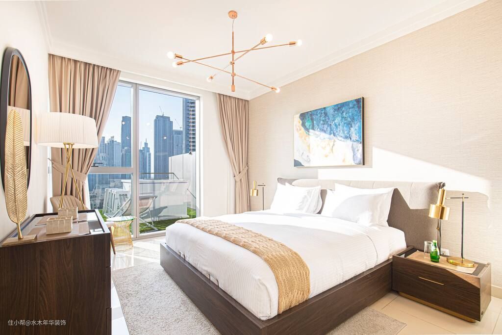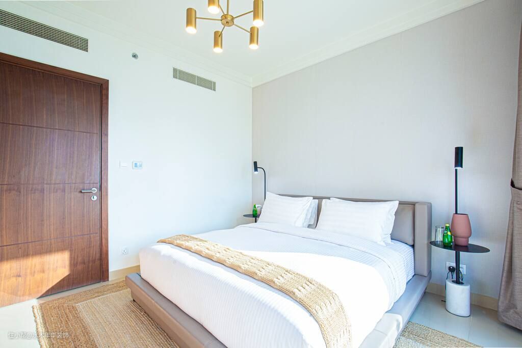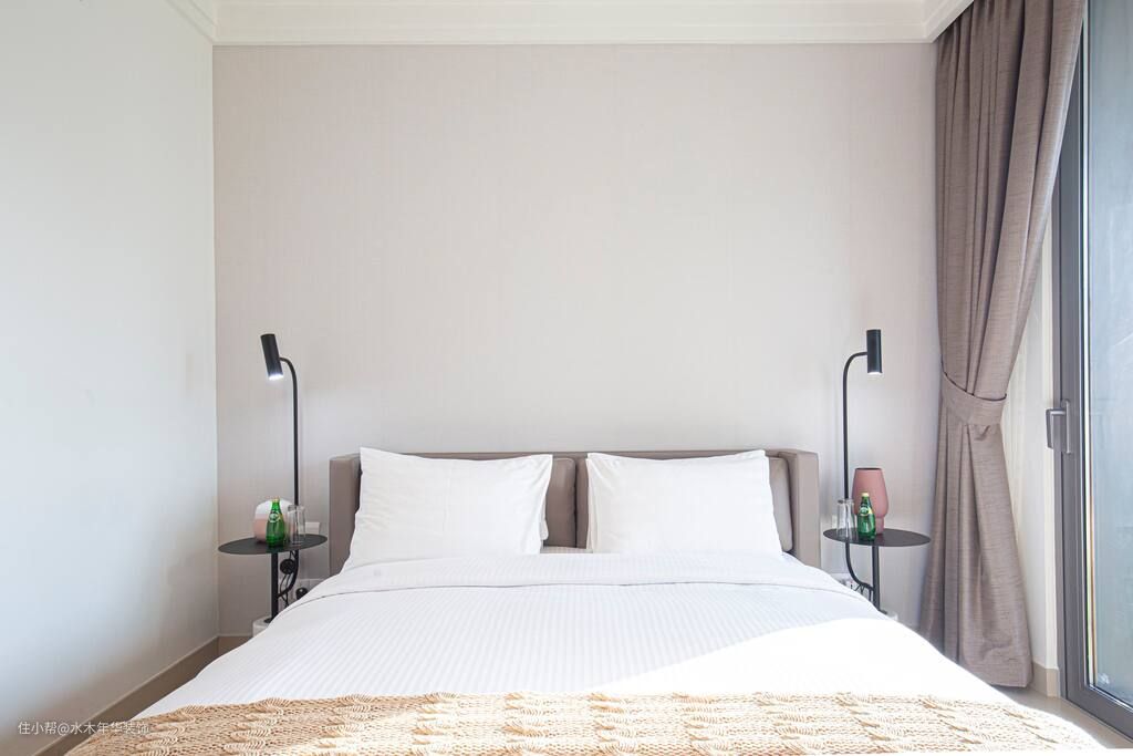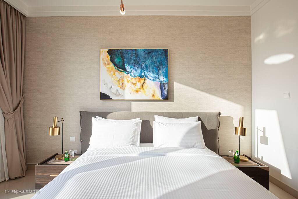 次卧看起来简约大气。纯白的床品搭配米黄色的亚麻床幔,温馨舒适。床头两侧设计了圆凳充当床头柜,上面摆放着灯具,满足业主局部采光的需求。次卧地面增添了地毯,有效地减缓了噪音的产生。地毯不仅装饰了空间,而且提升了空间的整体气质。
