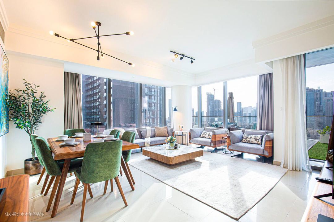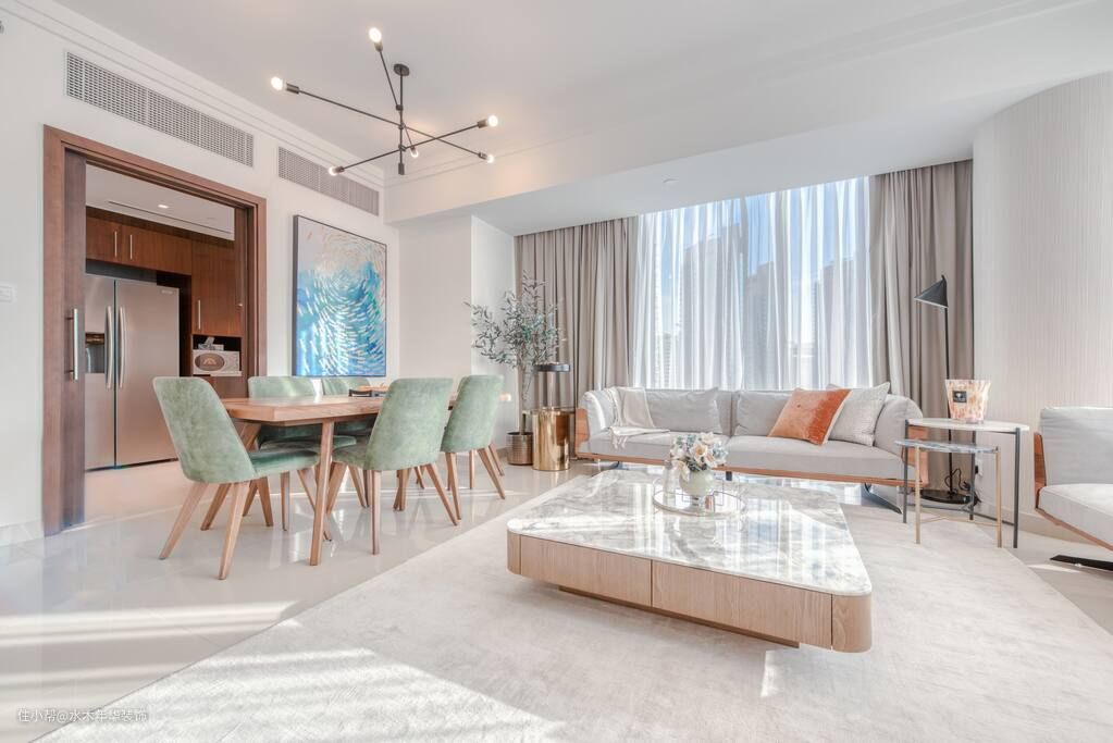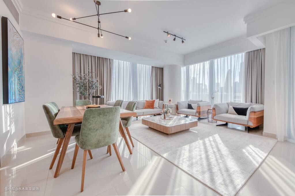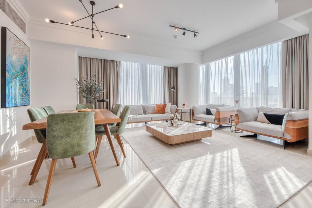 这是一套轻奢风的装修案例。业主追求高品质生活,希望我们合理规划,为自己打造一个精致时尚的家居空间。设计师根据业主的需求和喜好,以奶油白为主色调,点缀以牛油果绿、天蓝色,融入金属元素、木质元素和玻璃元素,为业主打造了一个通透明亮又华贵高级的家。从户型结构上来看,业主家建筑面积118平,属于三室两厅一厨一卫的户型格局,空间职能完善,可以满足业主家的生活需求和娱乐需求。设计师采用了客餐厅一体化的设计,合理有效地利用了空间。在客厅和厨房之间,做了门洞设计,明确地划分了空间职能。