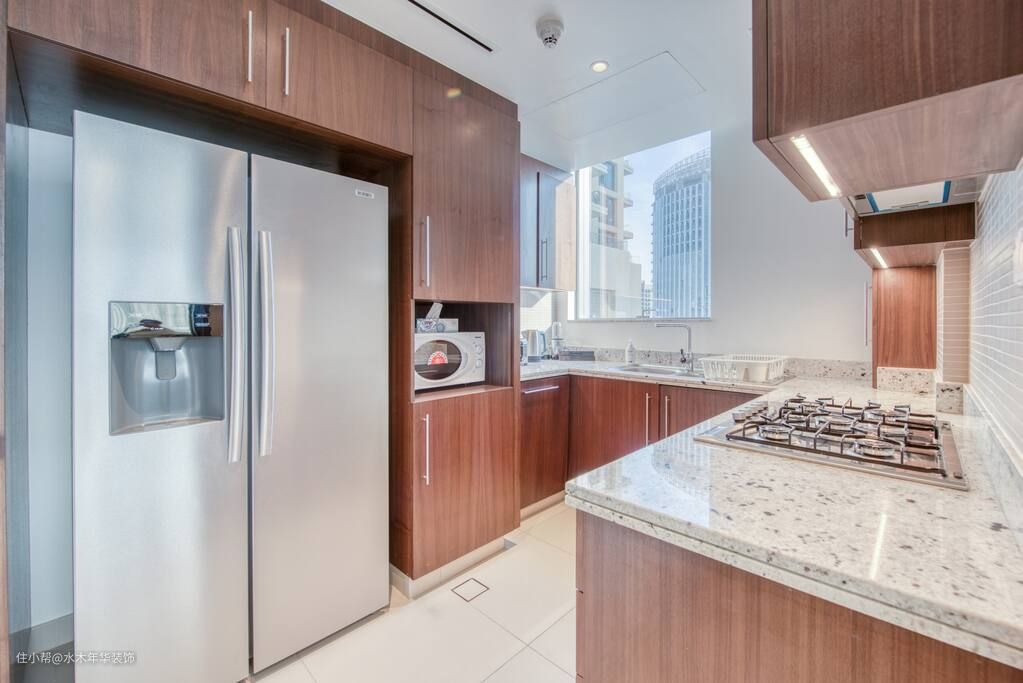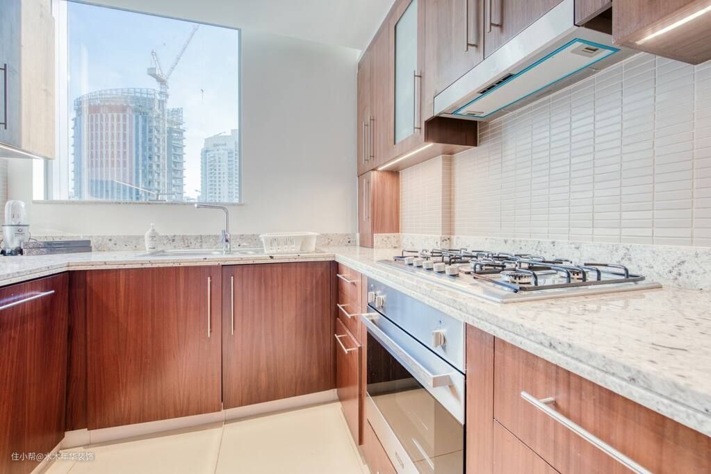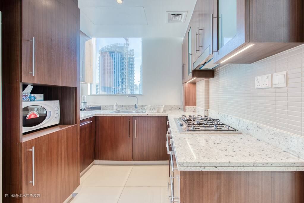 厨房与客厅之间做了门洞设计,明显地划分了空间职能。厨房做了U型设计,动线流畅,功能分区明显,最大化了操作台面,便于烹饪者备菜。水槽的位置设计在了窗户前,通风和采光良好,避免滋生细菌。操作台面选用了大理石材质,便于业主清理。地柜和吊柜的组合满足了厨房的收纳需求,用于分类收纳餐具和厨具。冰箱做了内嵌式设计,嵌于高柜下方,美观规整的同时增强了厨房的收纳能力。