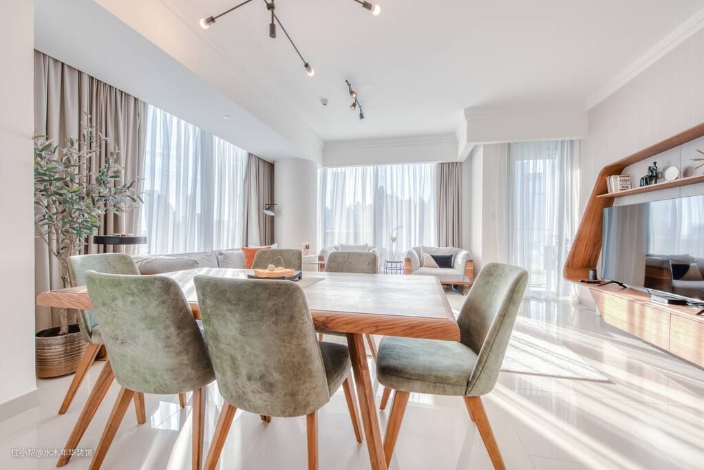 客餐厅一体化的设计提高了空间的利用率,增强了两个空间之间的互动性,也体现了空间的包容性和多元性。设计师选择了牛油果绿的餐椅,为餐厅增添了一抹亮色,看起来清新又雅致。红棕色的木质餐桌取材健康环保,桌面尺寸适中,可容纳六个人同时就餐,既可以满足日常的用餐需求,也可以满足亲友的聚餐需求。餐厅上方设计了线性灯具,用来辅助采光,烘托用餐时温馨的氛围感。